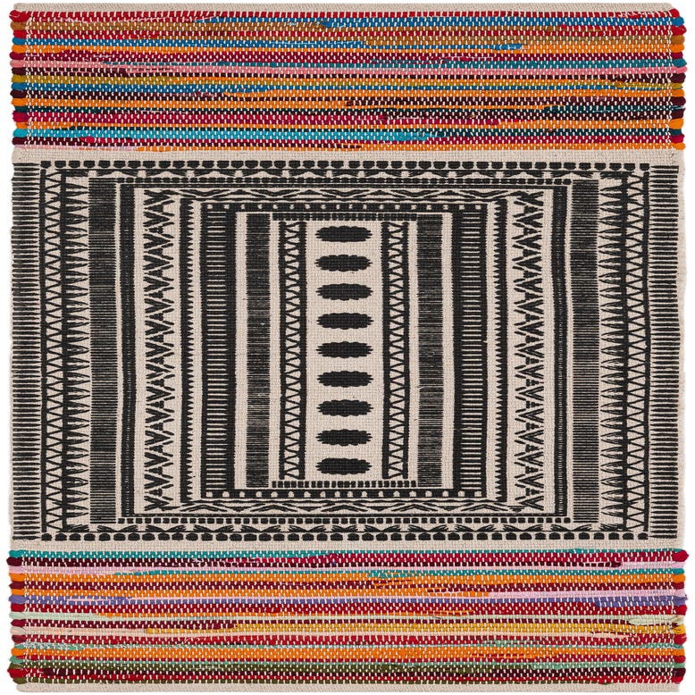Hand-braided from 100% cotton, this runner pairs a graphic black-and-ivory geometric field with a multi background and vibrant braided ends. The center features stacked rectangular borders, linear motifs and a column of round dot shapes in black on an ivory ground, creating a strong, rhythmic pattern. At each end, thick bands of handwoven, rag-style braids introduce stripes of blue, teal, red, pink, yellow, brown and violet that sit slightly raised against the flatter central weave. The tactile surface is low-profile with visible braided texture that feels soft underfoot while showing clear handwork and woven character.