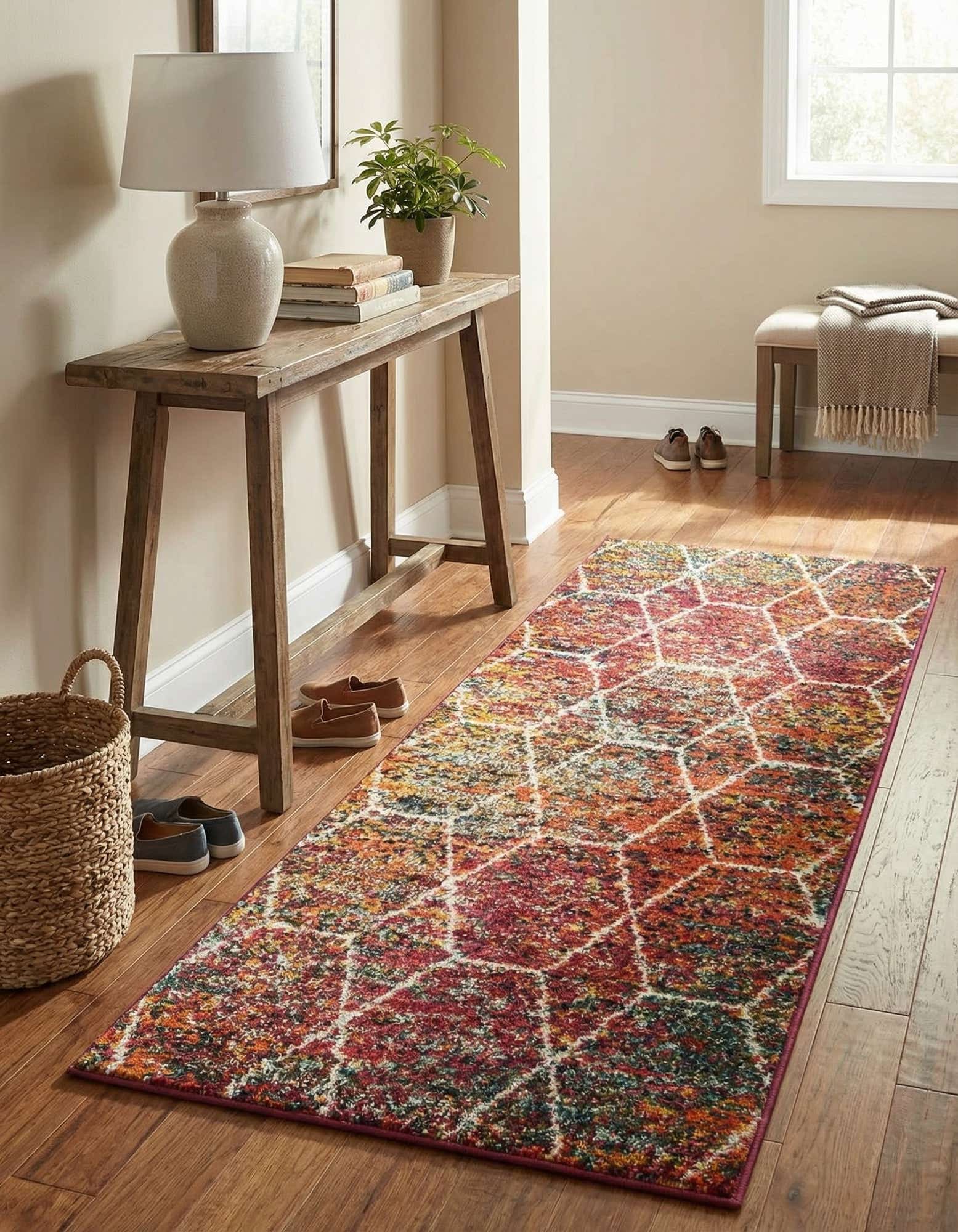 A 5 ft runner rug with a multi-colored, contemporary trellis pattern in shades of red, orange, yellow, and teal.