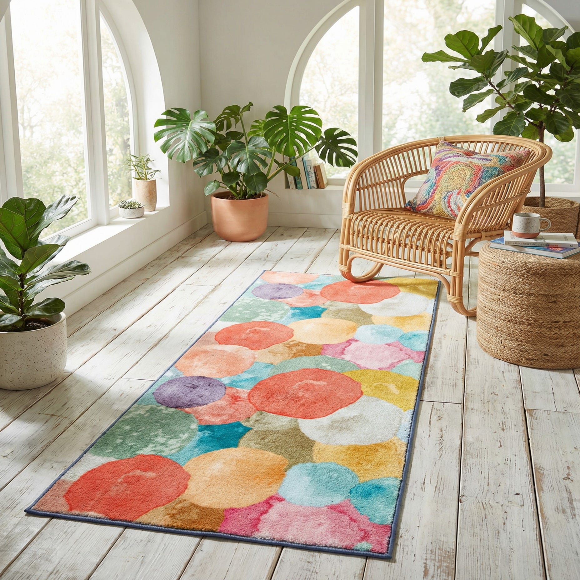 Machine-made from polyester, the pile has a soft, velvety feel that’s comfortable underfoot and holds color well. The runner works nicely in a hallway or entry to introduce personality, and it’s equally at home at the foot of a bed or along a kitchen passage where you want a splash of color. Pair it with neutral furniture to let the hues pop, or layer it into a modern, eclectic, coastal, or bohemian scheme for an energetic, curated look.
