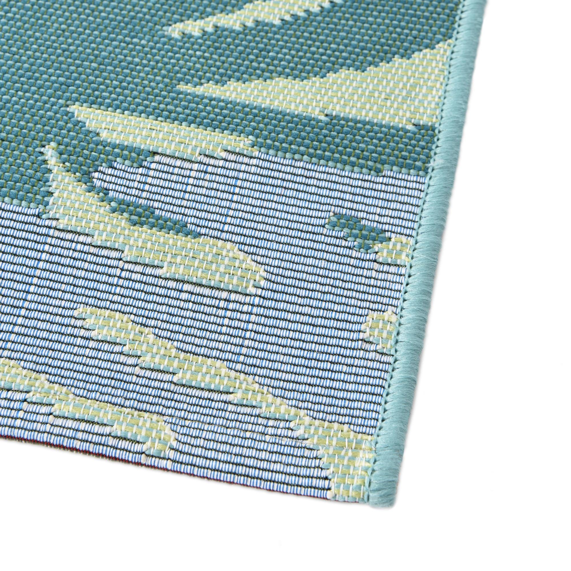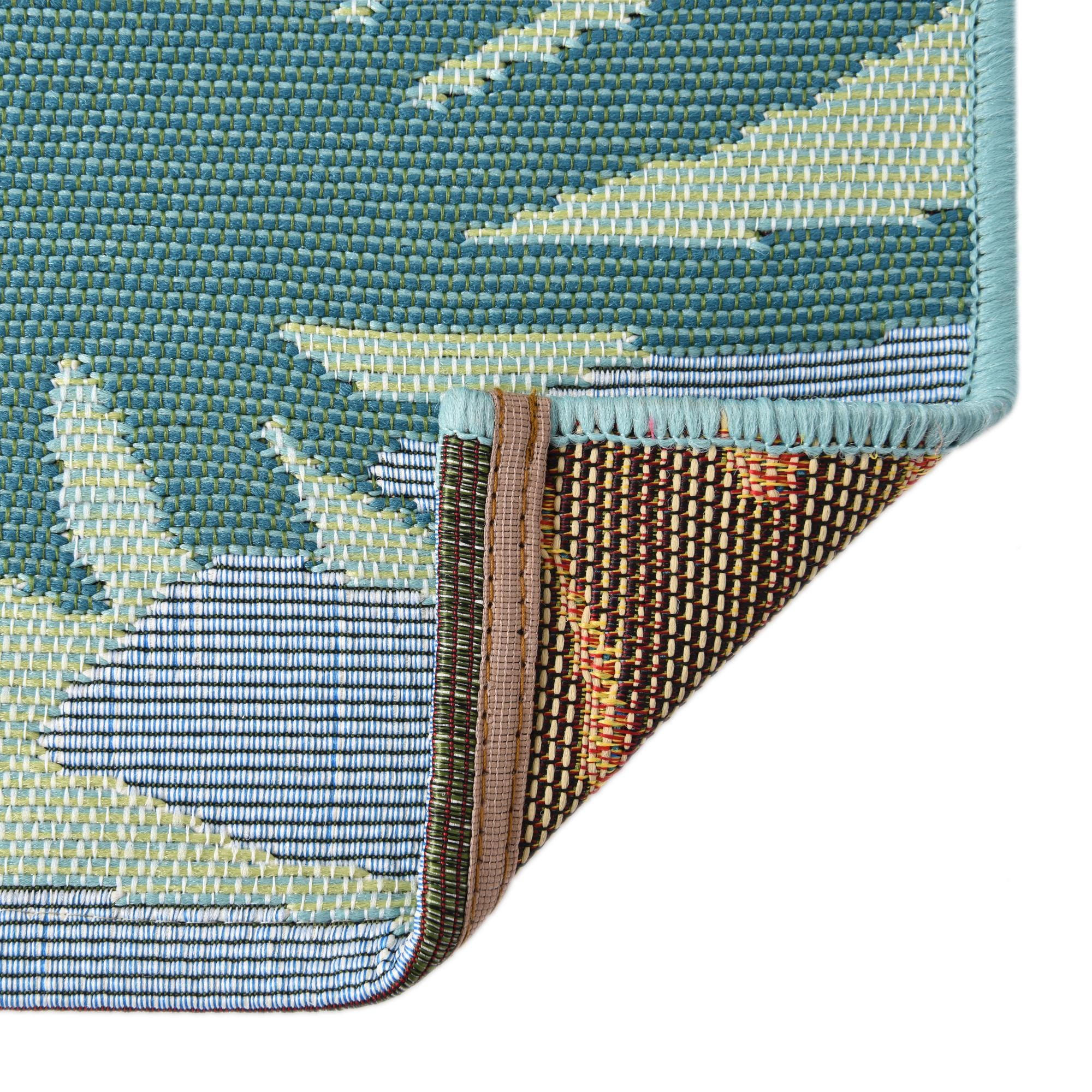 A lively tropical motif fills this runner with layered palm and monstera leaves in a mix of blue, navy blue, light blue, olive, light green, yellow and ivory set against a multi background. The pattern is bold but not fussy — large-scale foliage overlaps in a balanced layout that reads fresh and intentional. Machine made from 75% polypropylene and 25% polyester, the rug has a low-profile, tightly woven texture with fine ribbing that gives the surface a subtle dimensional quality you can feel underfoot.