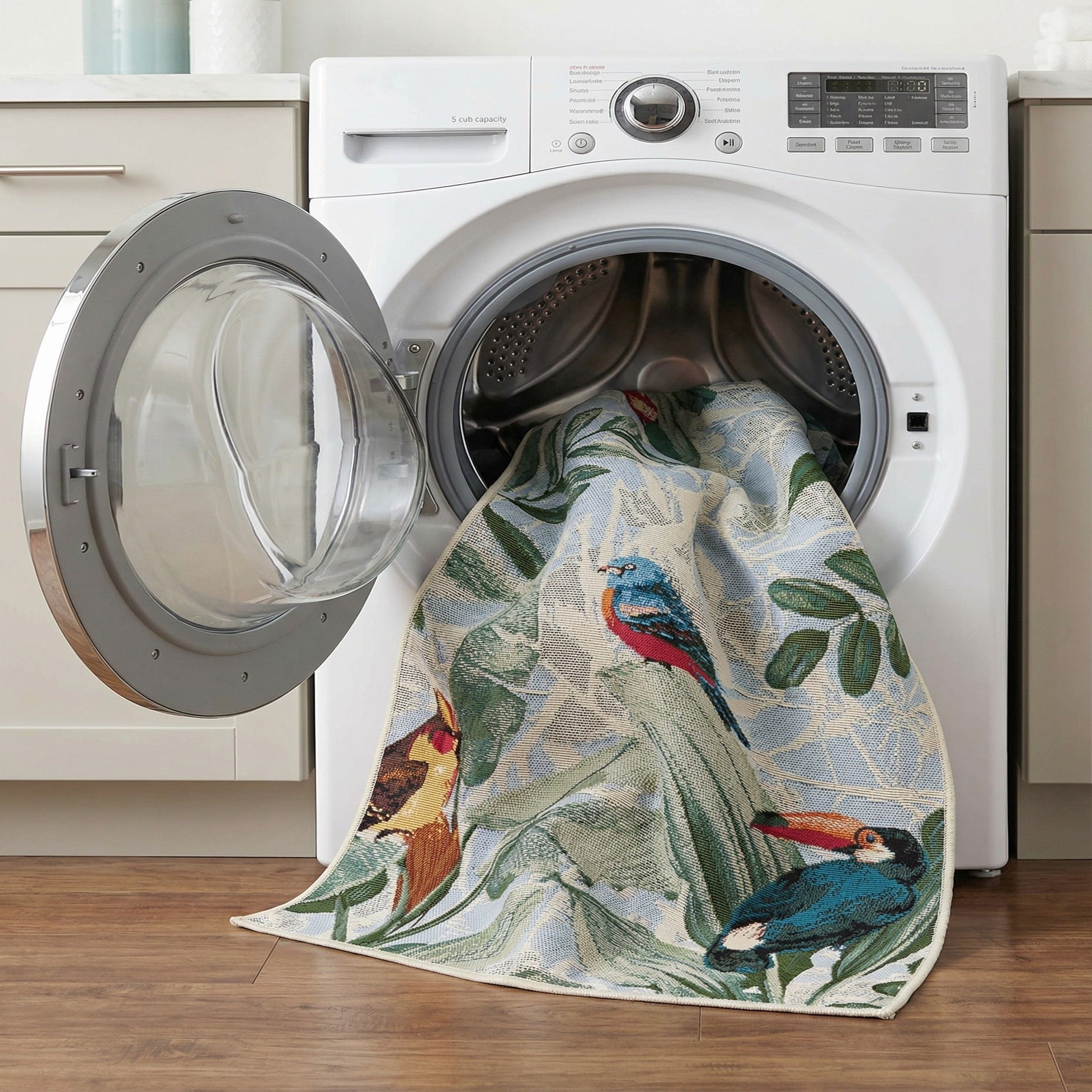 A multi-colored 5 ft runner rug with a vibrant botanical pattern featuring tropical birds and lush green leaves on a light blue and beige background.