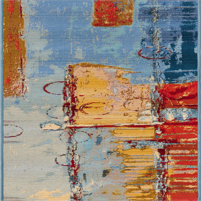 A 5 ft runner rug with a modern abstract pattern in shades of blue, red, yellow, and orange, suitable for a hallway or patio.