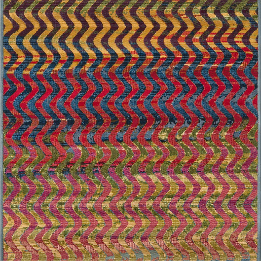 A 5 ft multi-colored runner rug with a modern wavy stripe pattern in shades of red, blue, yellow, green, and purple, suitable for a hallway or patio.