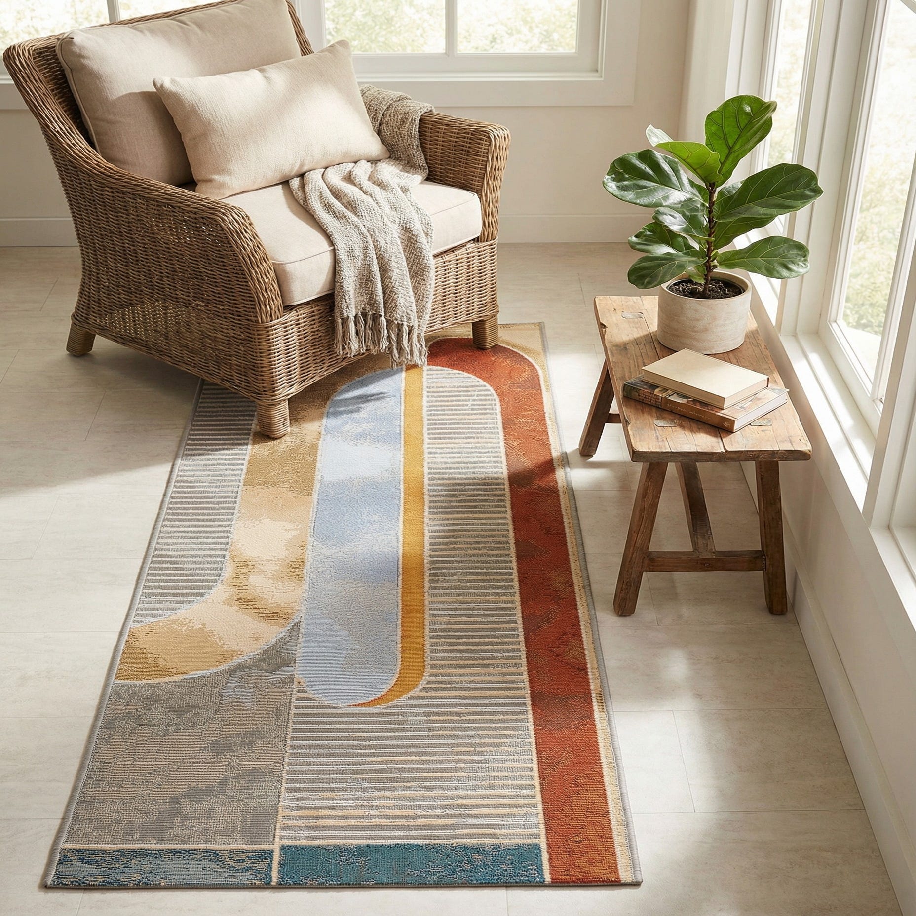 A multi-colored contemporary runner rug featuring abstract shapes and lines in rust, blue, gold, and grey.