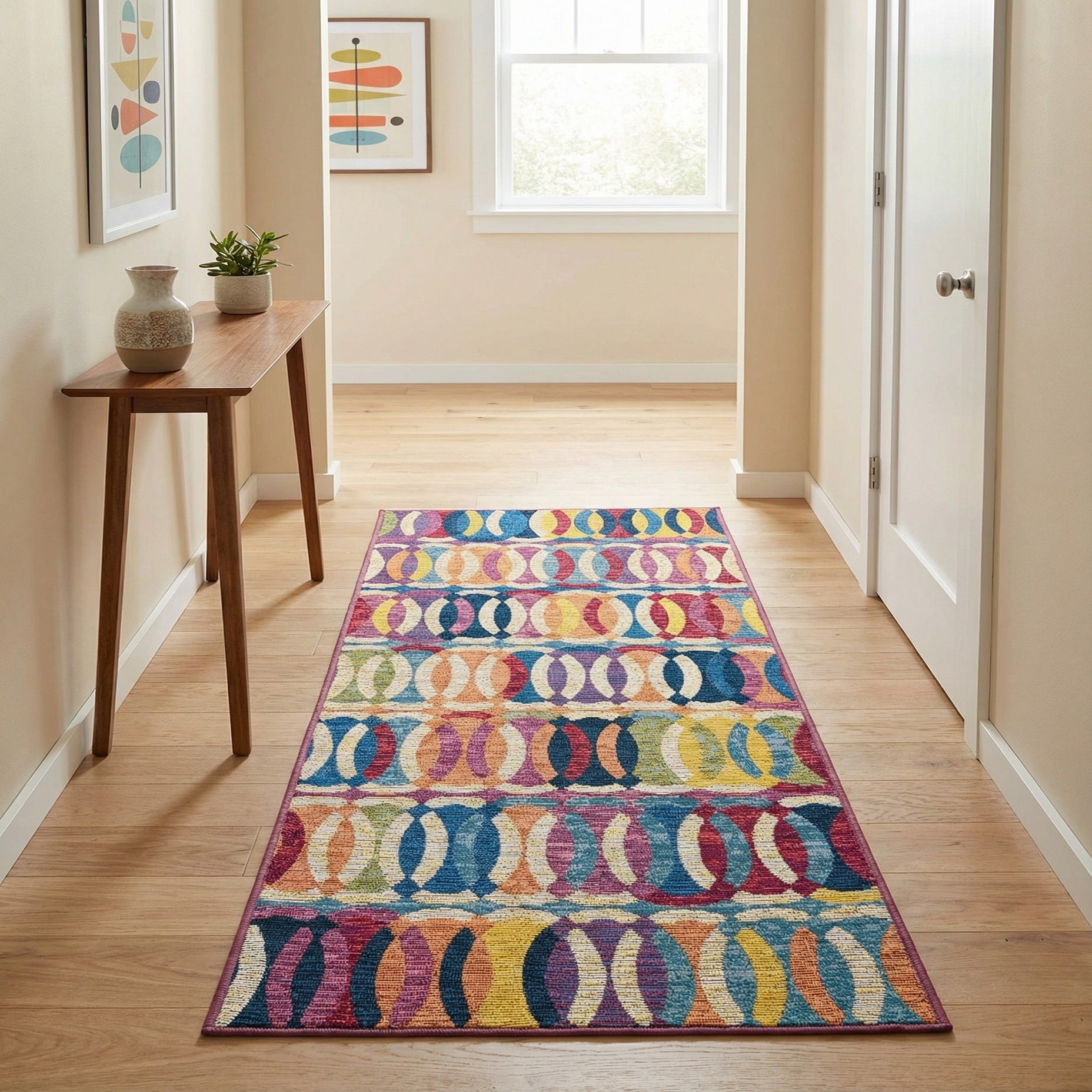 A vibrant multi-colored runner rug featuring a contemporary abstract pattern of interlocking circles in blue, yellow, red, and purple hues, ideal for a hallway or patio.