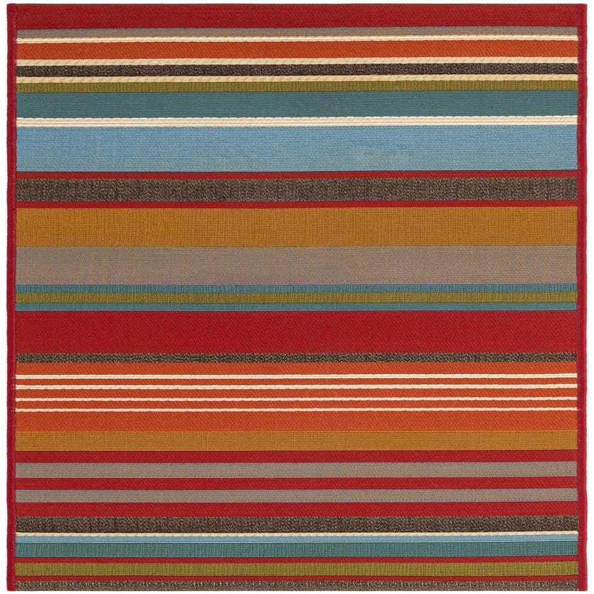 A 5 ft runner rug featuring bold horizontal stripes in various widths and colors including red, orange, blue, green, brown, and cream.
