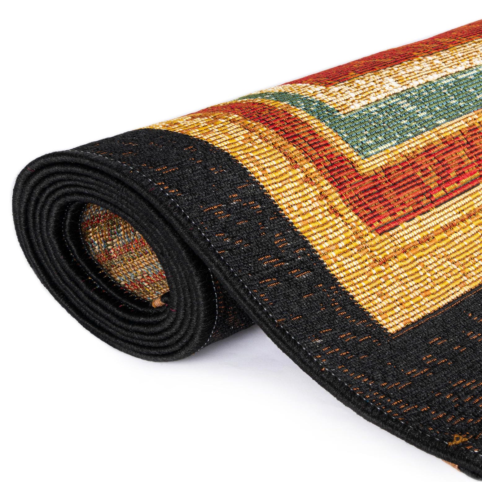 A 5 Ft runner rug featuring a modern, abstract pattern of concentric rectangles in multi-colored stripes, including black, gold, rust, and teal.