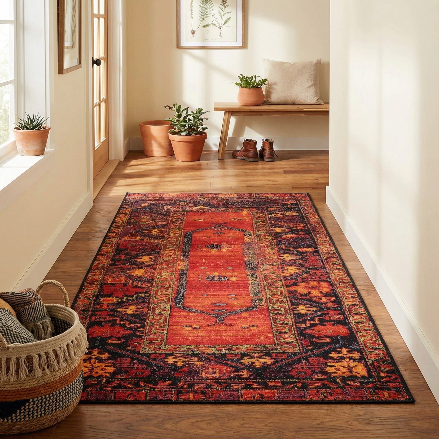 A 5 ft runner rug in a multi-colored Southwestern tribal pattern, featuring shades of red, orange, and black.