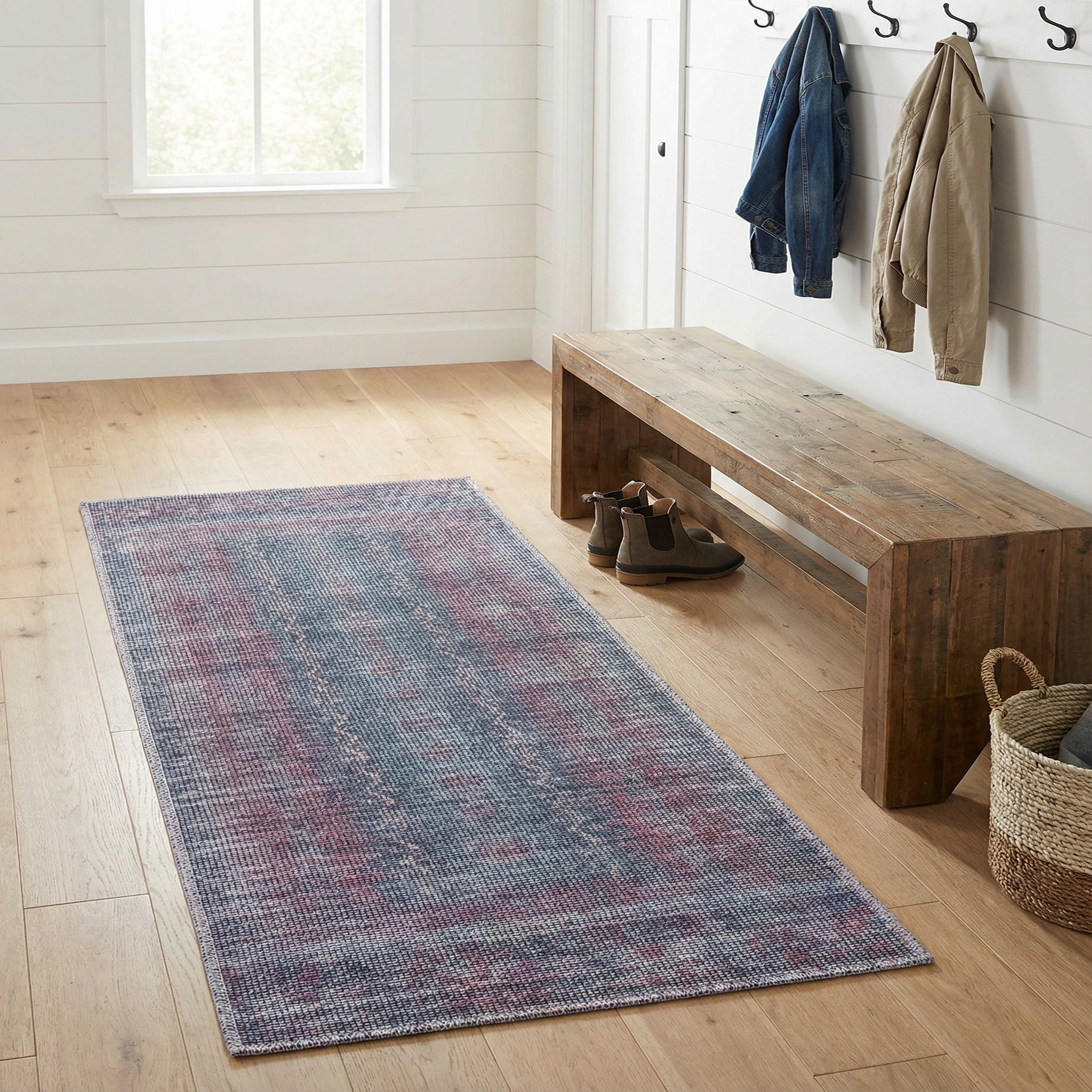 A softly distressed traditional runner with a narrow central medallion and subtle guard borders, this rug balances classic motifs with a textured, woven appearance. The multi-colored background blends beige and gray with deeper navy blue, while accents of red and green punctuate the pattern like hand-applied dye. A fine grid overlay and faintly worn effect give the design visual depth and a relaxed, lived-in character.