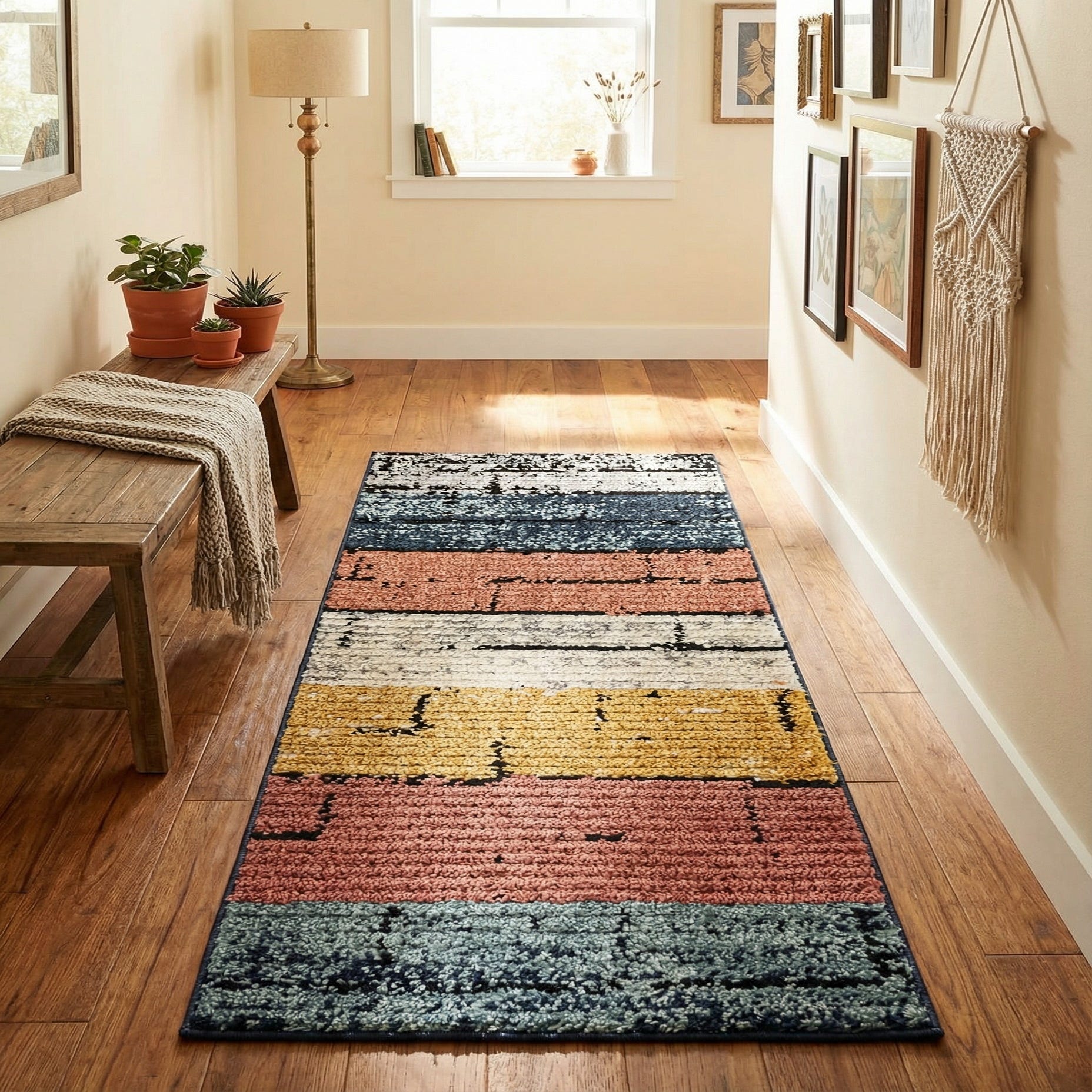 Machine made from 100% polyester, this runner brings bold color and texture into narrow spaces. It works well in entryways and hallways, adding visual interest to transitional and contemporary interiors, and pairs naturally with mid-century or eclectic furnishings. Use it to warm a kitchen aisle or to introduce layered color in a living room — combine with natural wood tones and matte black accents to echo the rug’s linear details.