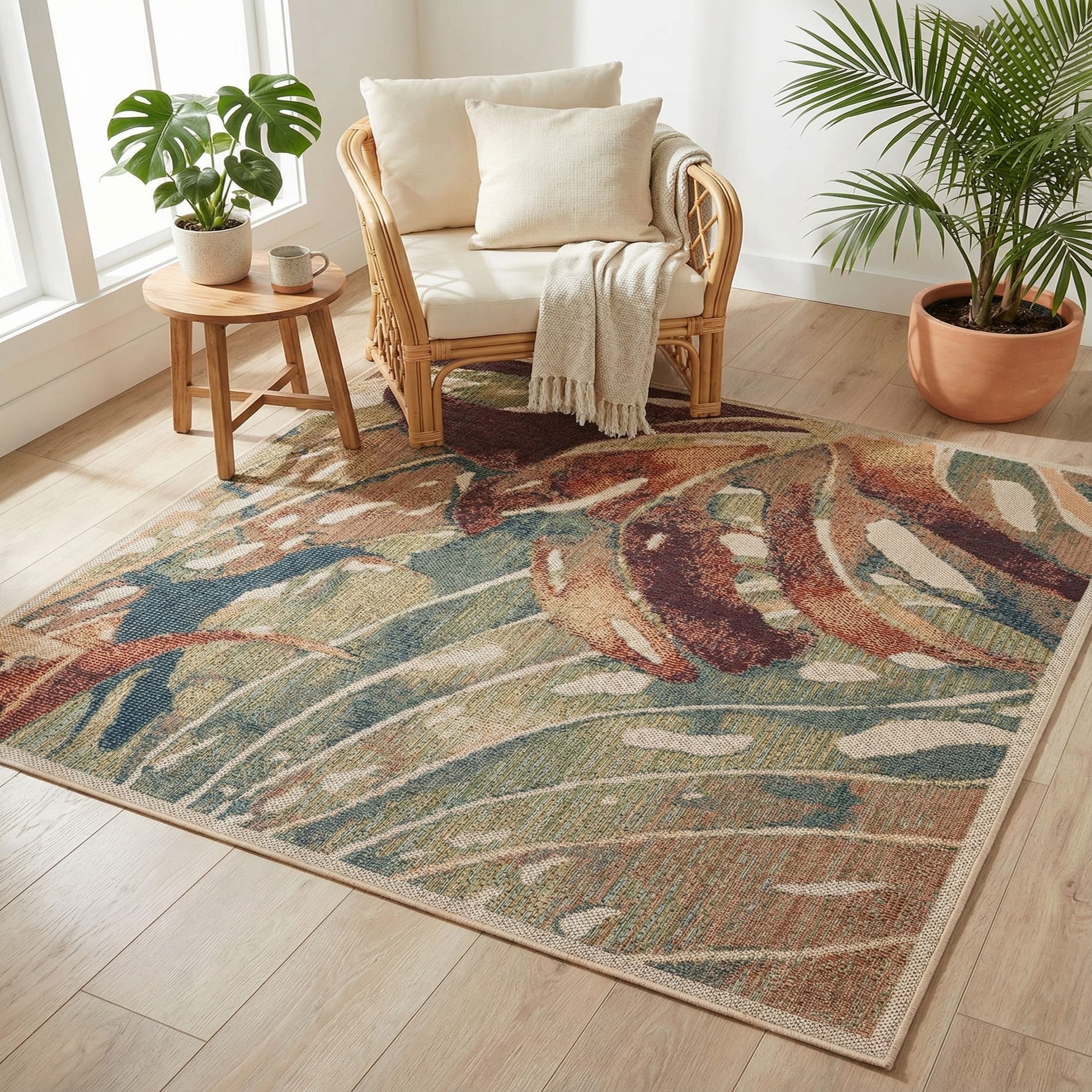 A multi-colored square rug featuring a modern botanical pattern with large teal, green, and rust-orange leaves, ideal for an indoor or outdoor patio.