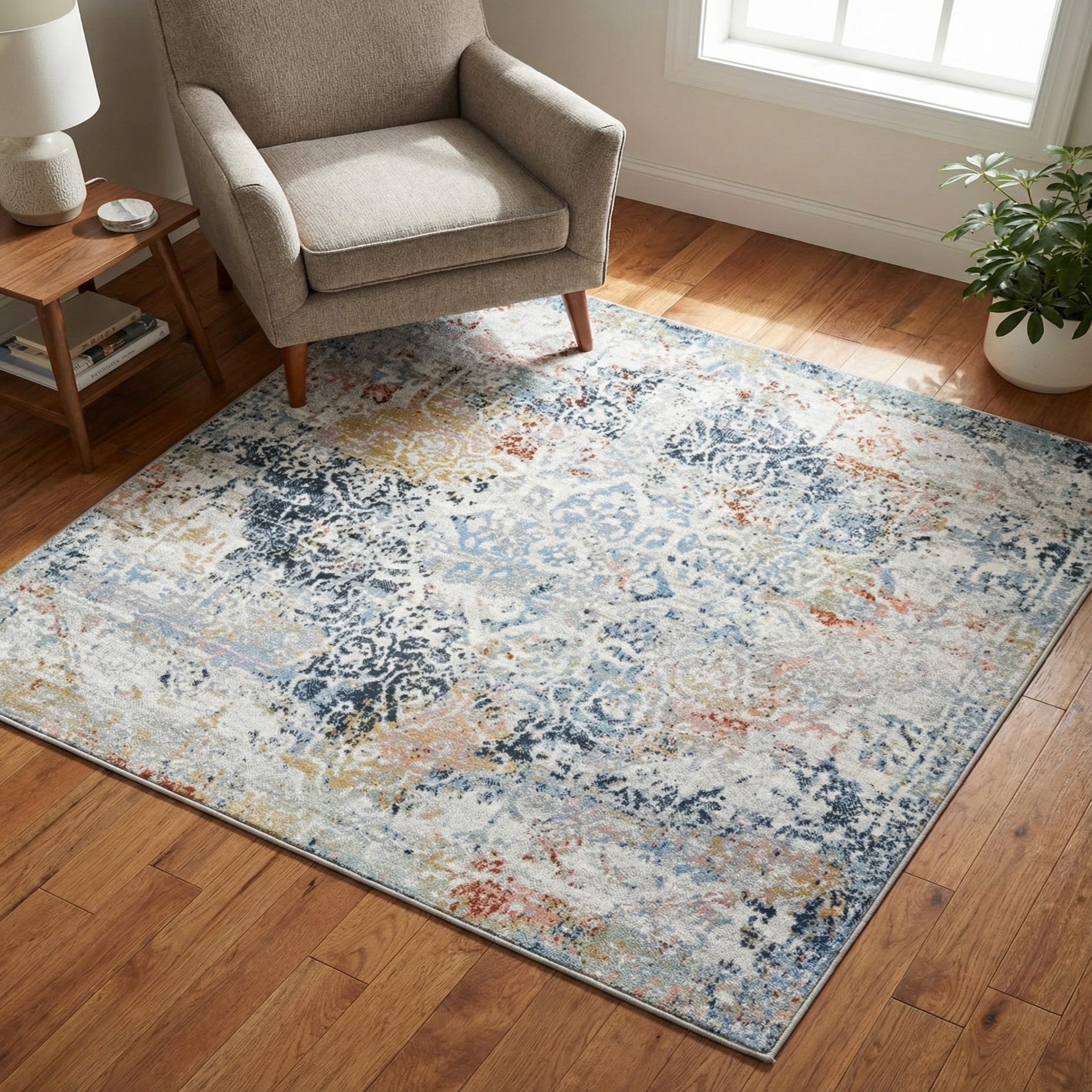 Primary color is Multi. Colors in this rug include: Multi, Blue, Gray, Ivory, Navy Blue, Rust Red, Pink.