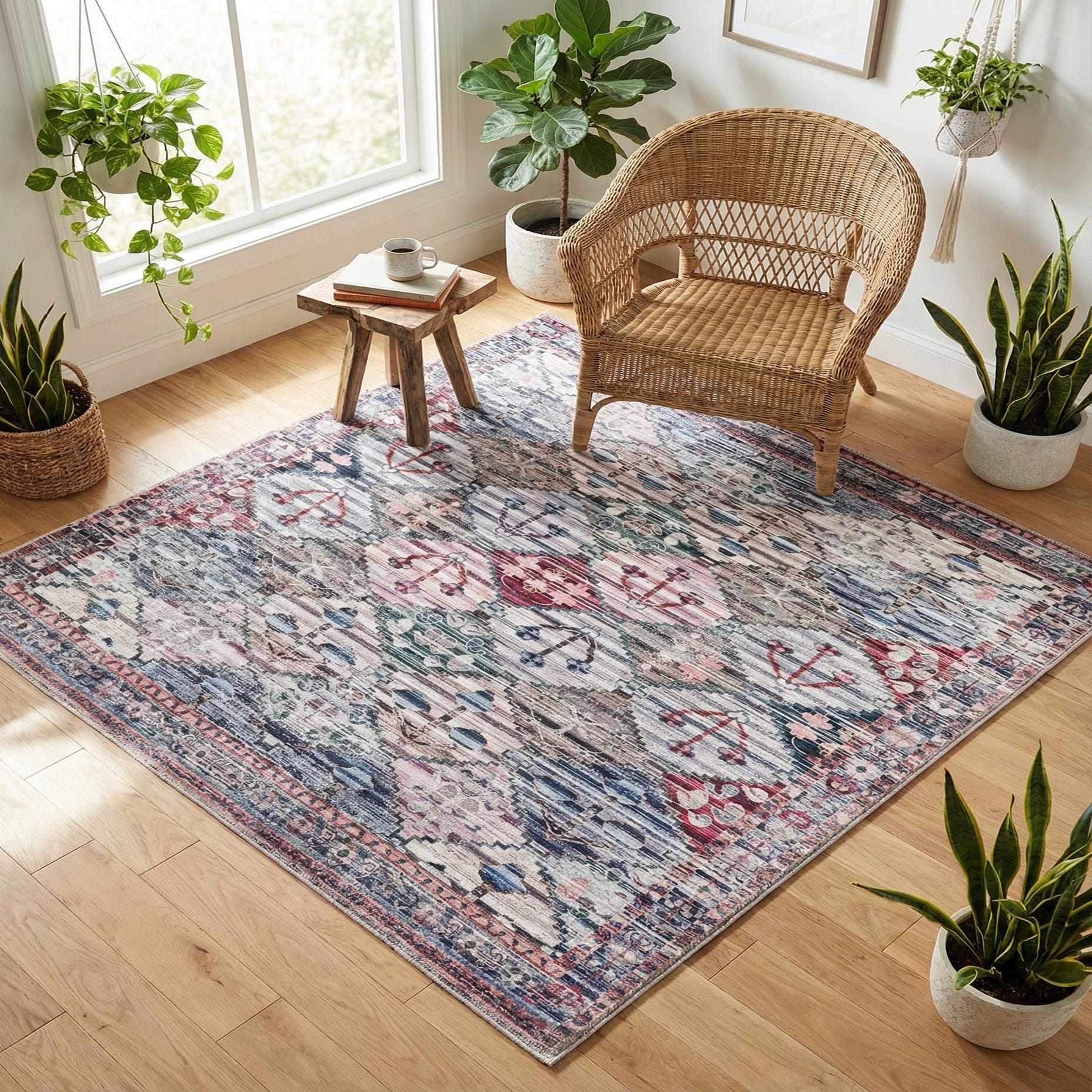 Stain-resistant and pet-friendly, this rug integrates easily into high-traffic areas and homes with active pets. It's also machine washable and shed-free, promoting ease of care and maintenance. The timeless design and practical attributes render the Mangata square rug suitable for a range of decor scenarios, from modern apartments to casual family rooms, and even in creatively styled office spaces.