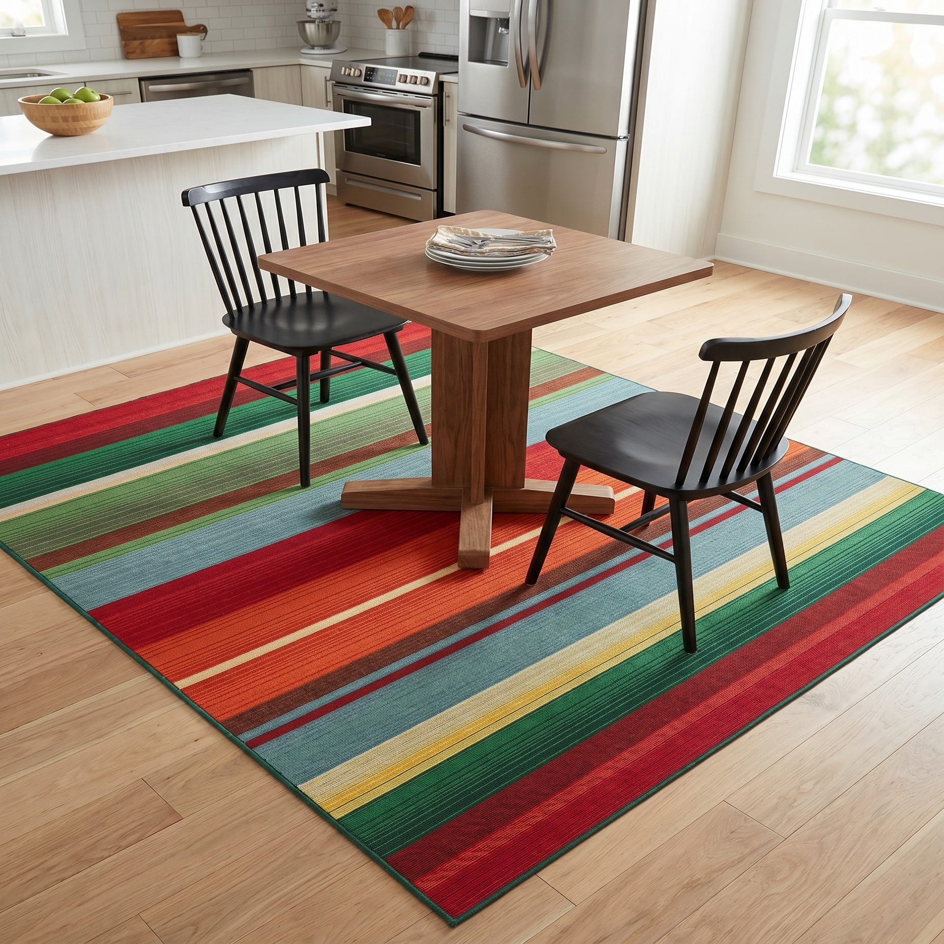 Fell in love with this rug when I saw it on-line for its delightful pattern and vivid colors. It arrived in two days from the day ordered about a week ago. We put it down on our renovated deck today...it is even more awesome than we thought it would be! The colors and pattern outset the colors of the deck perfectly.