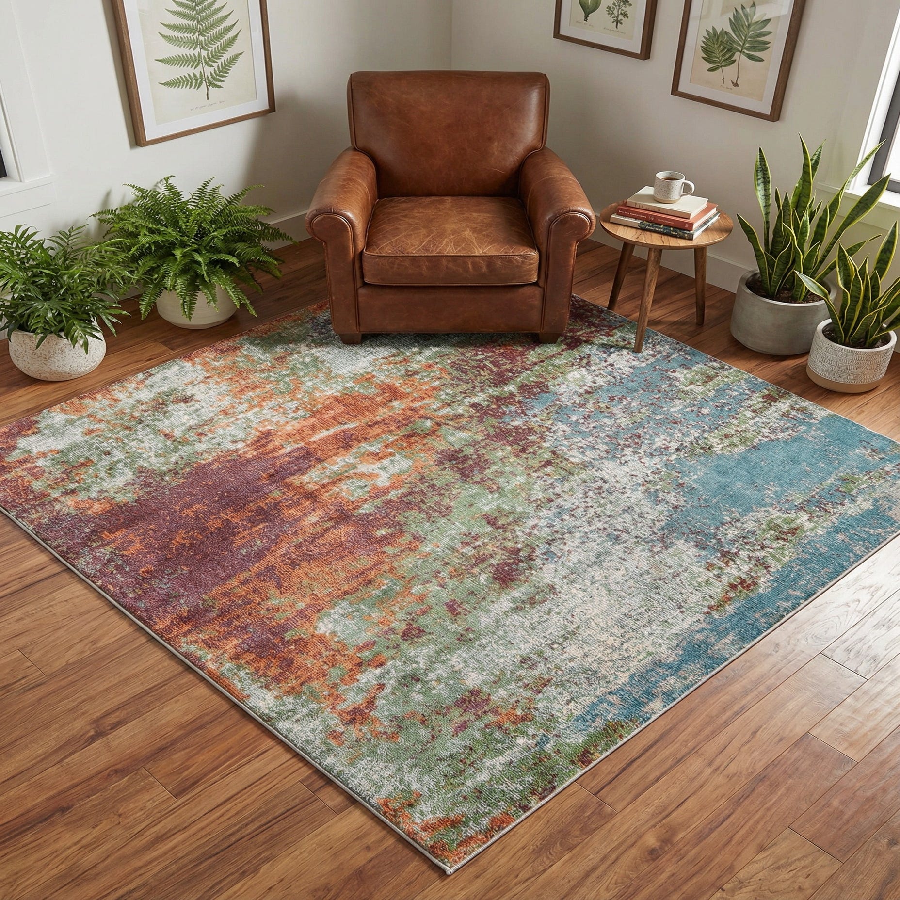 The rug showcases a blend of colors artistically distributed across the surface, creating an abstract, distressed style that adds character and warmth to any space. The mixed hues allow for versatility in styling, making this rug a suitable choice for a variety of decorating themes, from contemporary to rustic and everything in between.