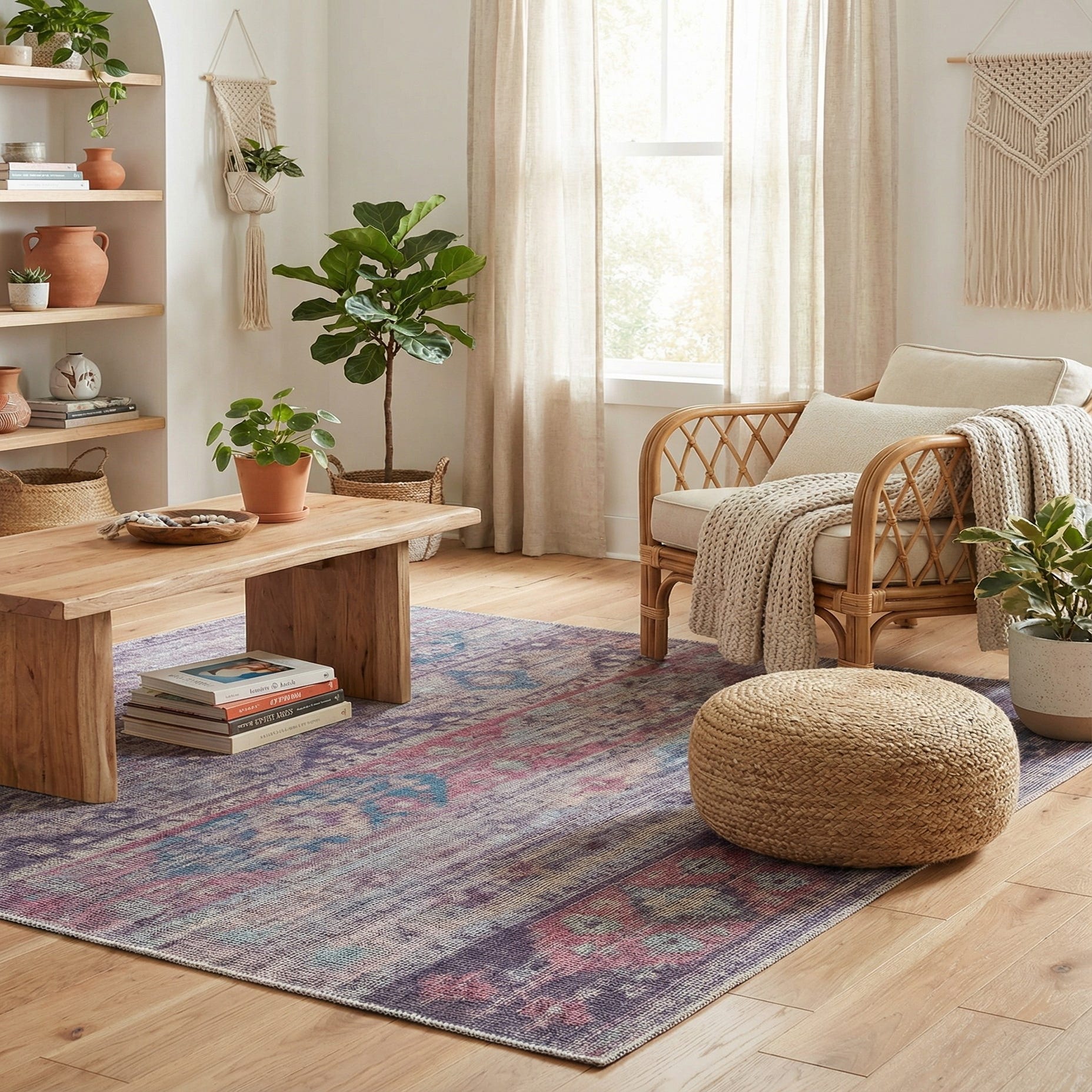 This piece works well in transitional, bohemian, or modern farmhouse interiors—pair it with warm wood furniture and textured neutrals for a grounded living room, layer it beneath a cozy reading corner with rattan and navy accents, or place it at the foot of a bed to introduce color and softness. Its subdued pattern and mixed palette make it easy to coordinate with both solid upholstery and patterned cushions, bringing a comfortable, collected look to smaller seating areas, entryways, or intimate lounges.