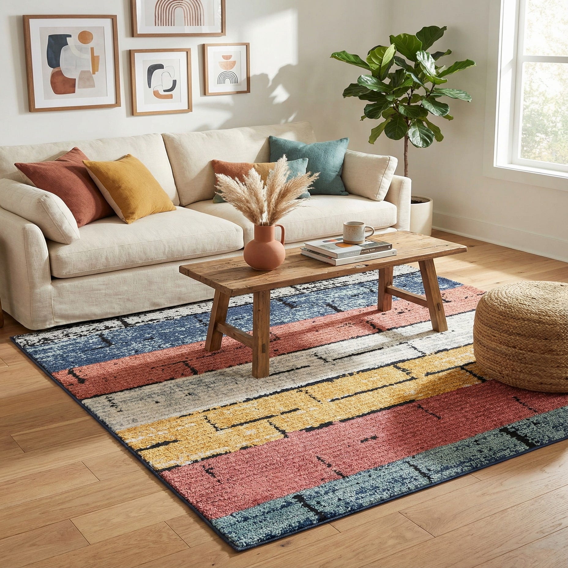 Machine-made from 100% polyester, the surface has a soft, slightly lustrous pile with gentle ribbing you can feel underfoot. Its construction and fiber choice make it well-suited to everyday spaces—place it under a sofa to anchor a contemporary living room, layer it in a bedroom to introduce color and warmth, or use it in an entryway or play area where lively pattern and easygoing style are welcome. The mix of navy, gray and ivory pairs nicely with cool-toned furnishings, while the peach, pink and yellow stripes bring a friendly contrast to wood and neutral palettes.
