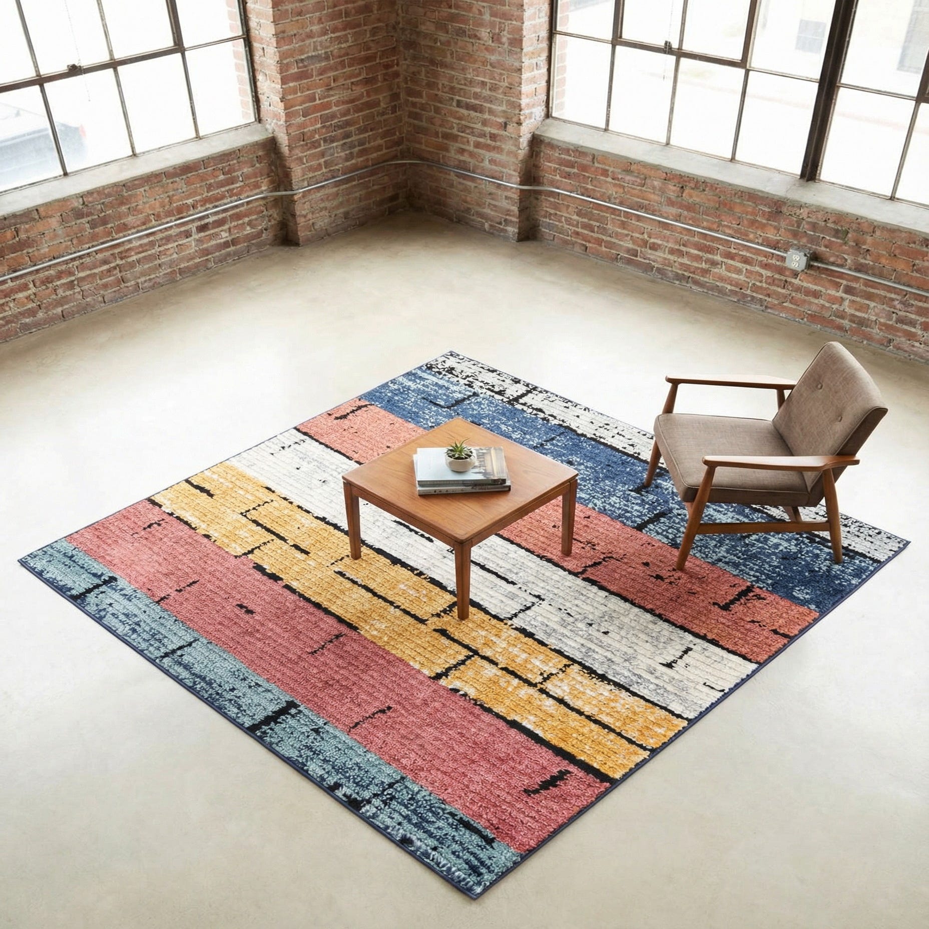 Color-blocked horizontal bands create a modern, graphic look with a relaxed, lived-in finish. Broad stripes of navy and light blue sit alongside coral-peach, warm pink, mustard yellow and ivory, all set on a multi background with scattered black lines that form a distressed, brick-like overlay. The pattern balances bold color with subtle texture, giving the rug visual interest from every angle.