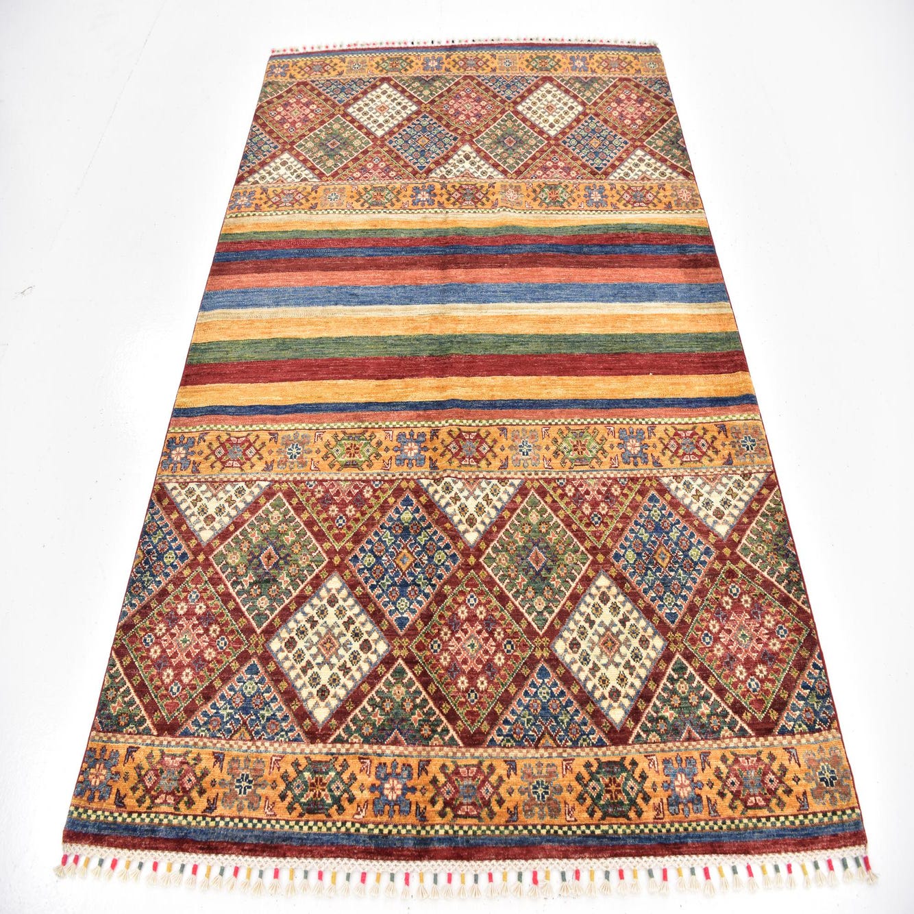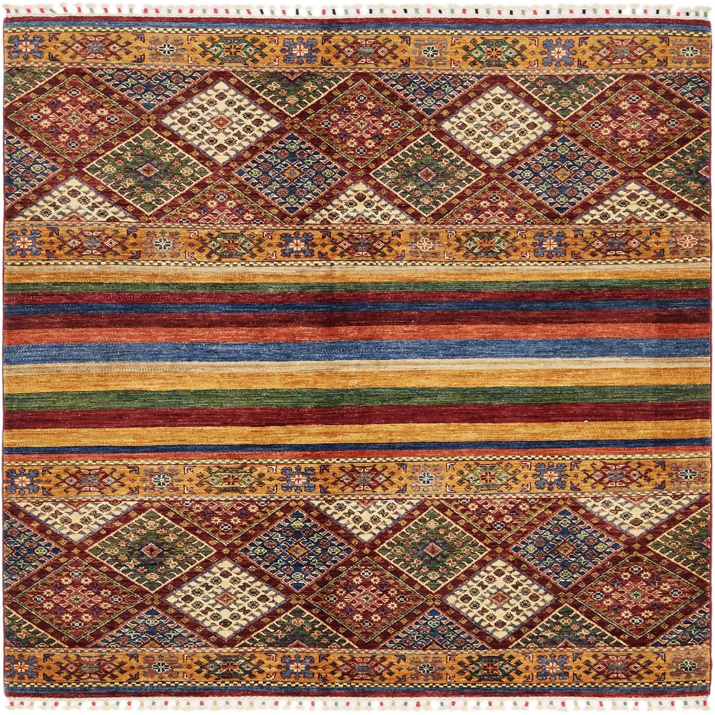 A 5x7 multi-colored rectangular wool rug featuring Southwestern and Oriental patterns with a central stripe design.