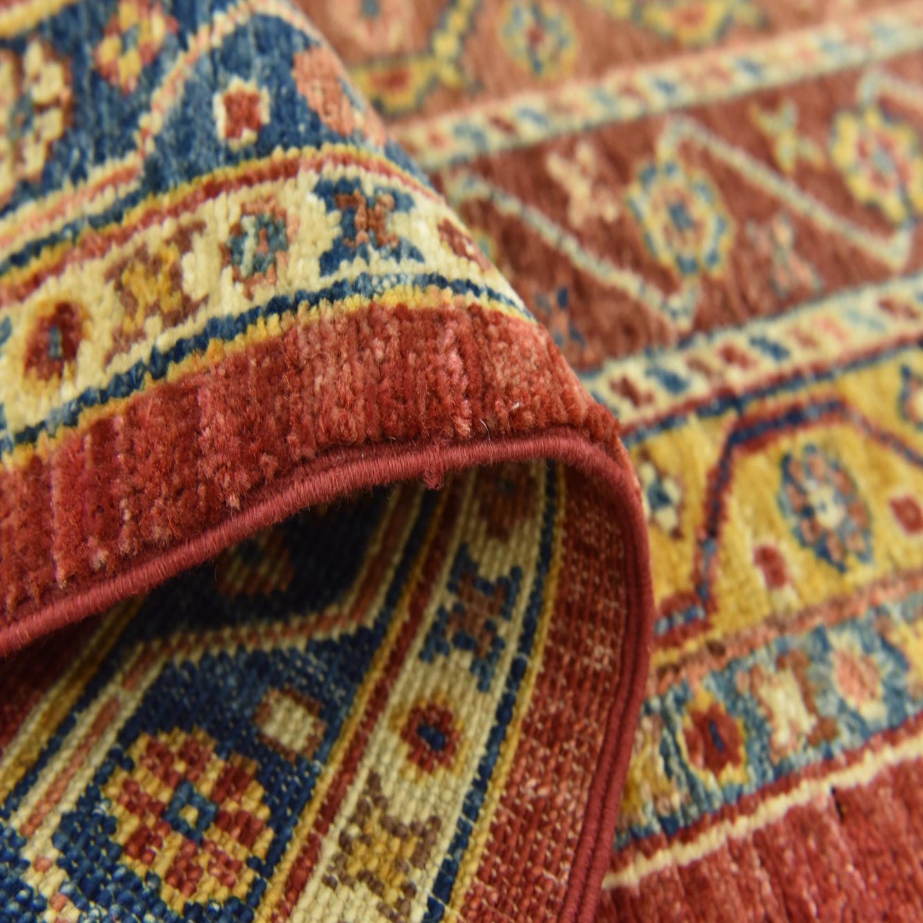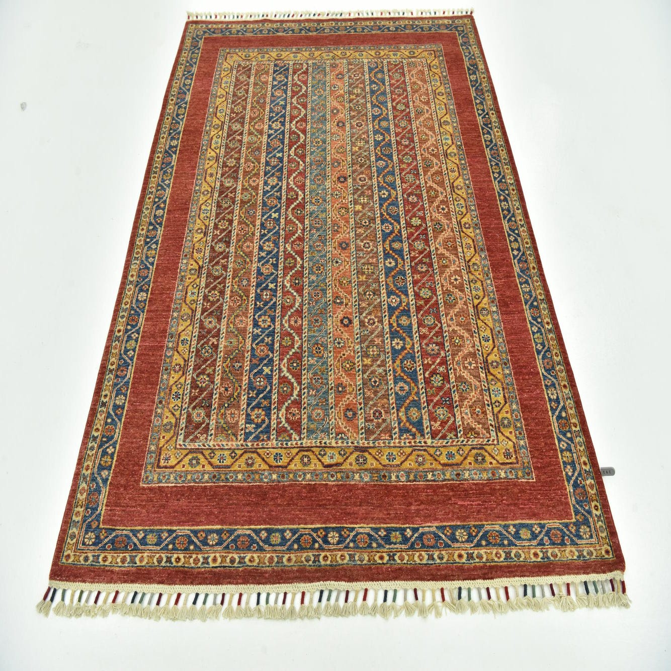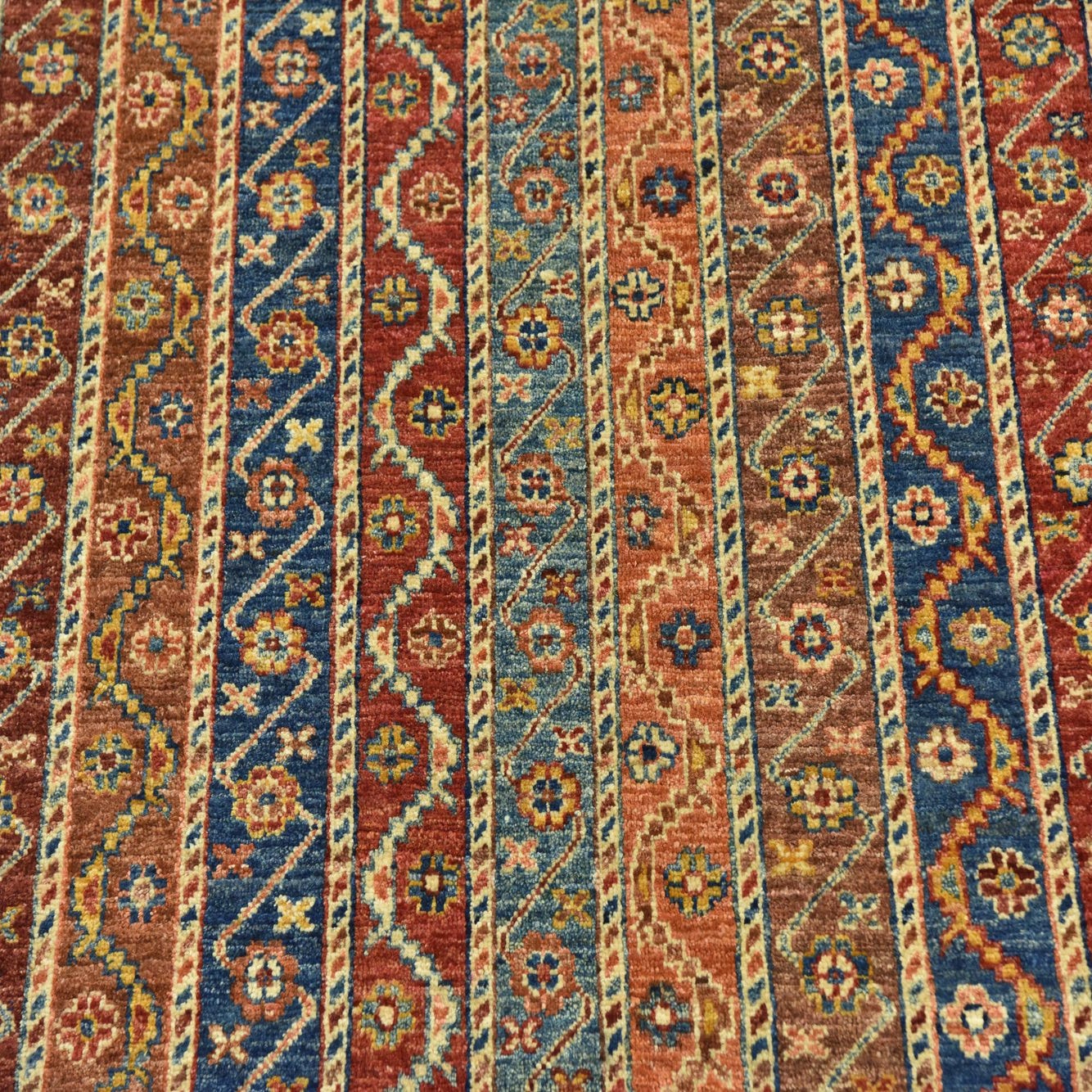 The Ariana Ziegler collection presents a 5x7 hand-knotted rug crafted from 100% hand-spun wool, which provides a texture that is both durable and soft underfoot. This rug features a dynamic and intricate pattern dominated by vertical stripes, each detailed with traditional motifs and symbols that evoke a sense of heritage and timeless elegance. The color palette is rich and varied, including hues of blue, brown, cream, light blue, olive, and plum red, with accents of navy blue and gold, all set against a multi-colored background. The depth of these colors creates a visually engaging landscape across the rug, while the inclusion of fringe on the edges adds a classic finishing touch.