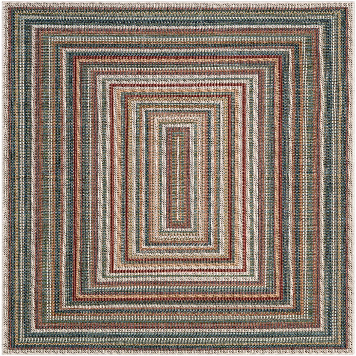 A 5x7 rectangular Baja Outdoor rug featuring a modern multi-colored striped pattern in shades of blue, red, green, and beige, suitable for indoor or outdoor use.