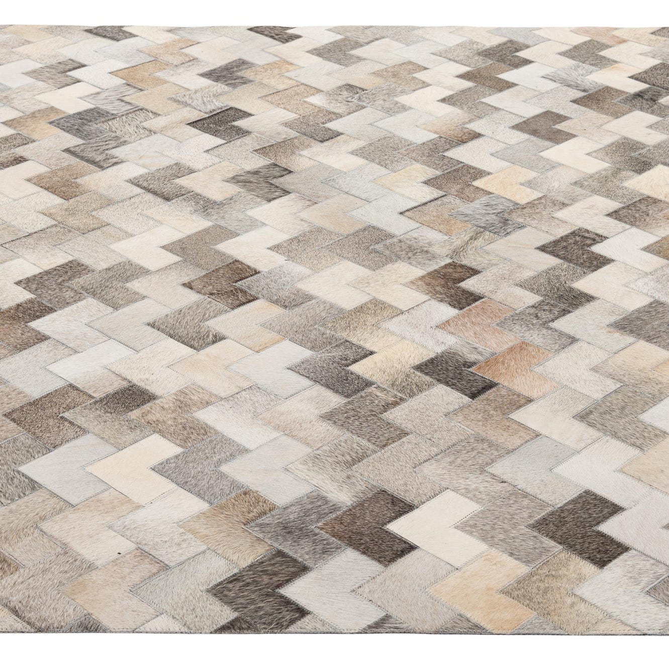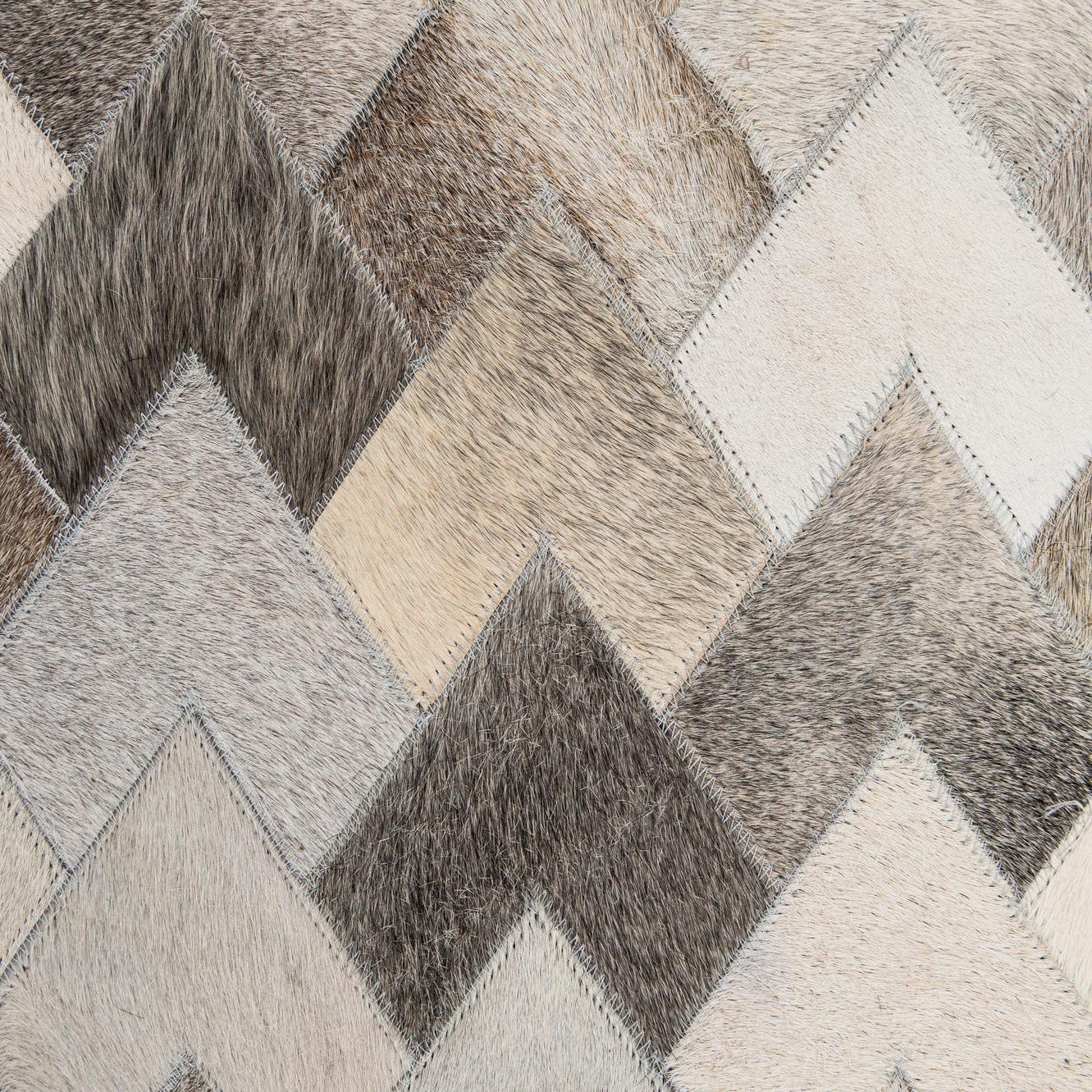 A 5x7 rectangular modern cowhide rug featuring a multi-colored chevron pattern in various shades of brown, grey, and cream.