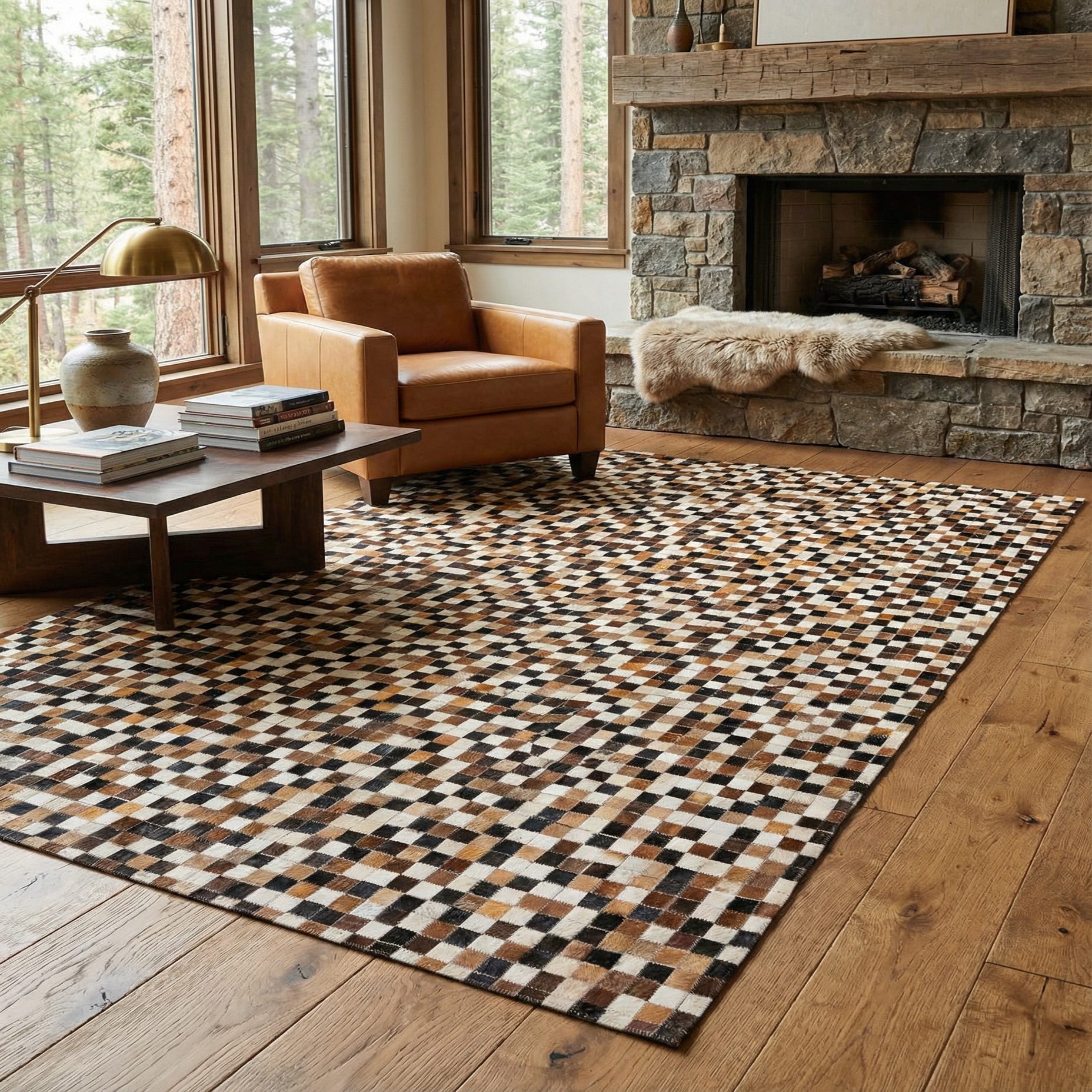 A compact mosaic of hand-cut squares creates a lively checkerboard pattern across a multi background. Warm neutrals—beige, light brown, brown, ivory—mix with deeper black accents to produce a grounded, layered look that reads both modern and organic. The repeating geometric layout gives the rug visual rhythm without feeling fussy, making it easy to pair with a range of furnishings.