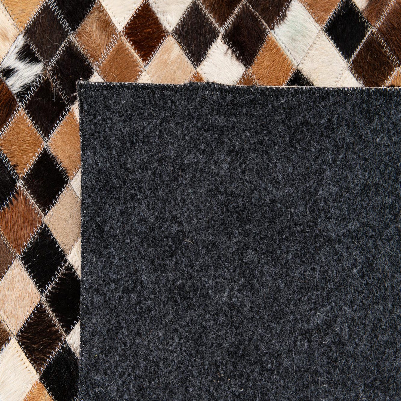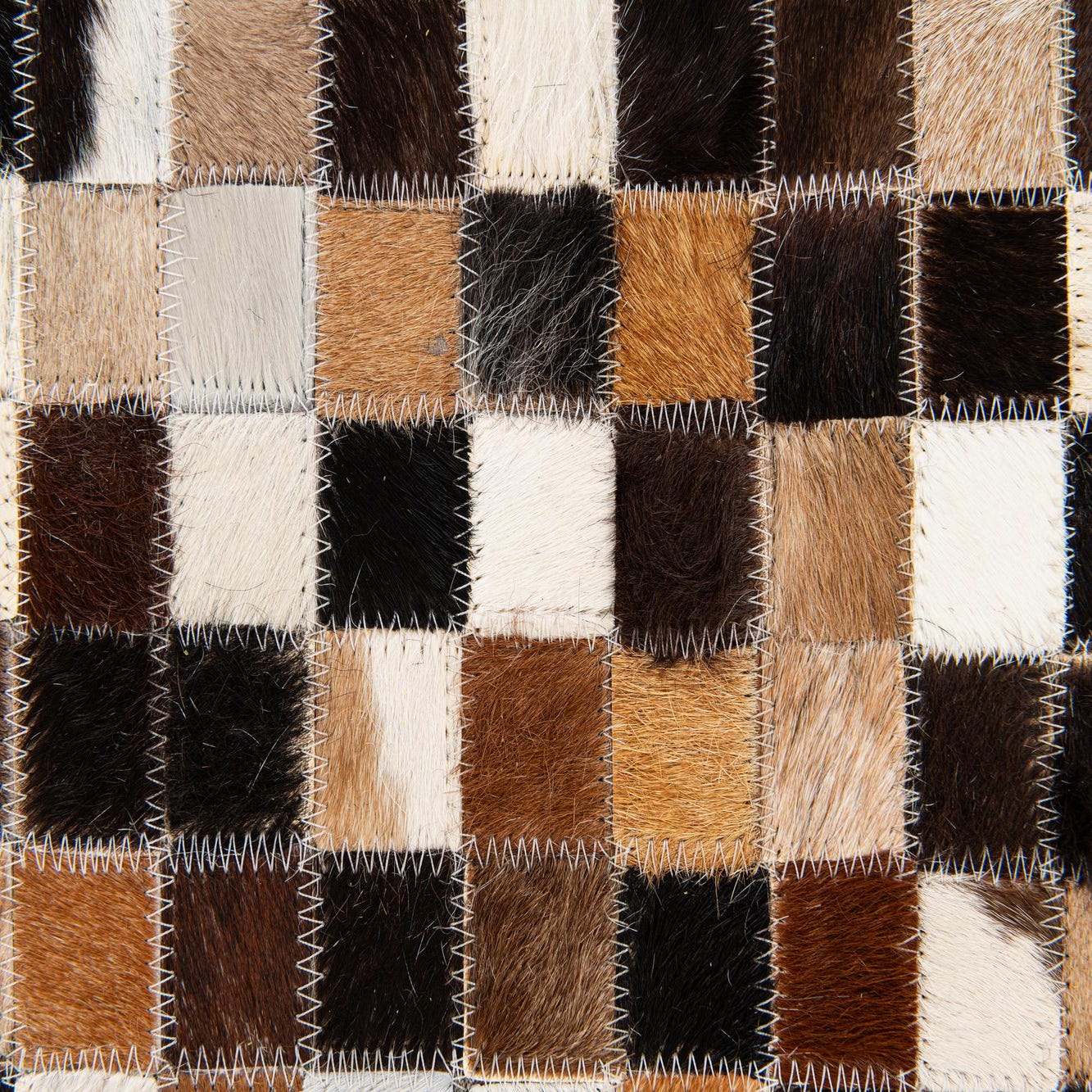 Handmade of cowhide and leather, this rug assembles hundreds of small square patches into a tight mosaic that reads as a pixelated checkerboard. The multi-tonal background moves between ivory, beige, light brown, tan, warm brown and black, creating a lively but grounded palette. Running stitch lines between patches add a subtle grid texture, while the hair-on-hide surface gives a soft, slightly glossy nap and gentle tactile variation where each hide meets the next.