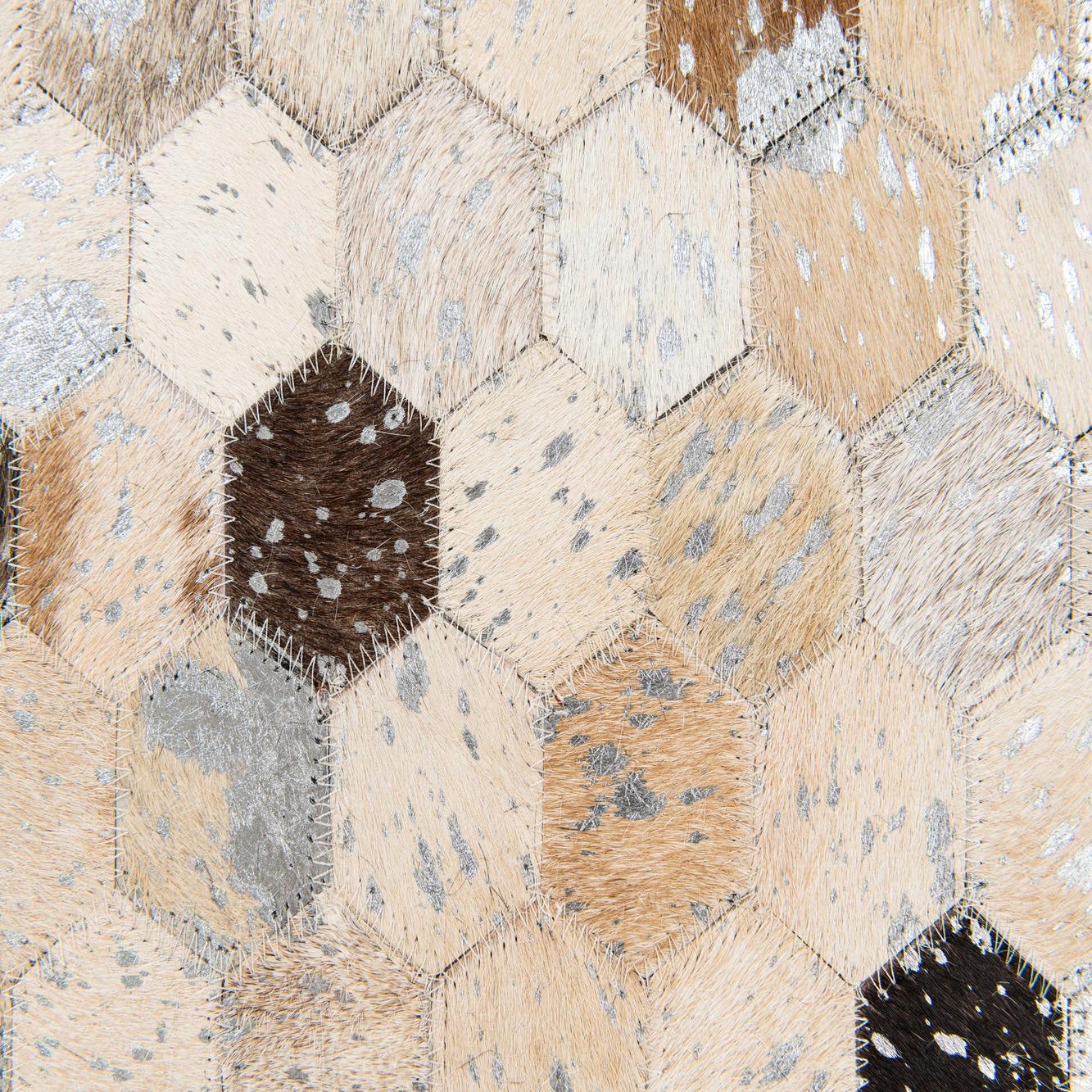 A 5x7 rectangular multi-colored modern cowhide rug with a mosaic of hexagonal patches in varying shades of beige, brown, black, and gray.