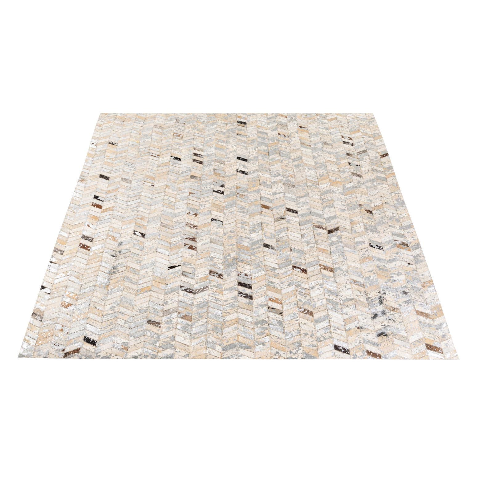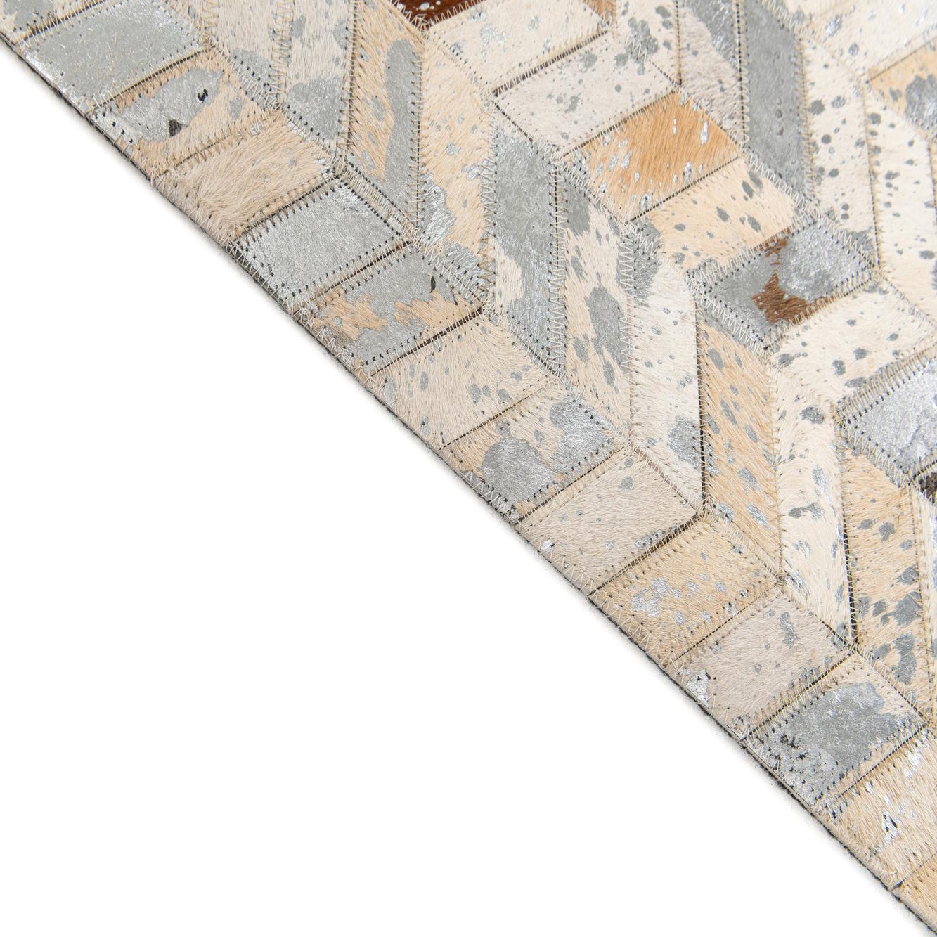 A 5x7 rectangular modern cowhide rug featuring a chevron pattern in various shades of white, beige, grey, brown, and black.
