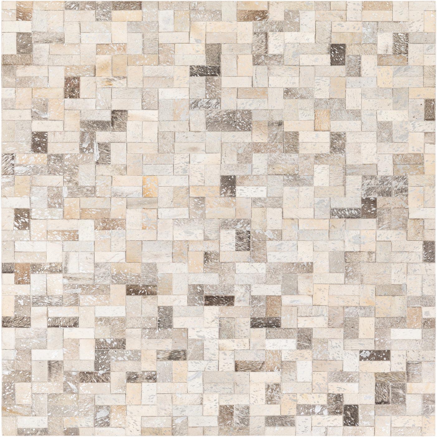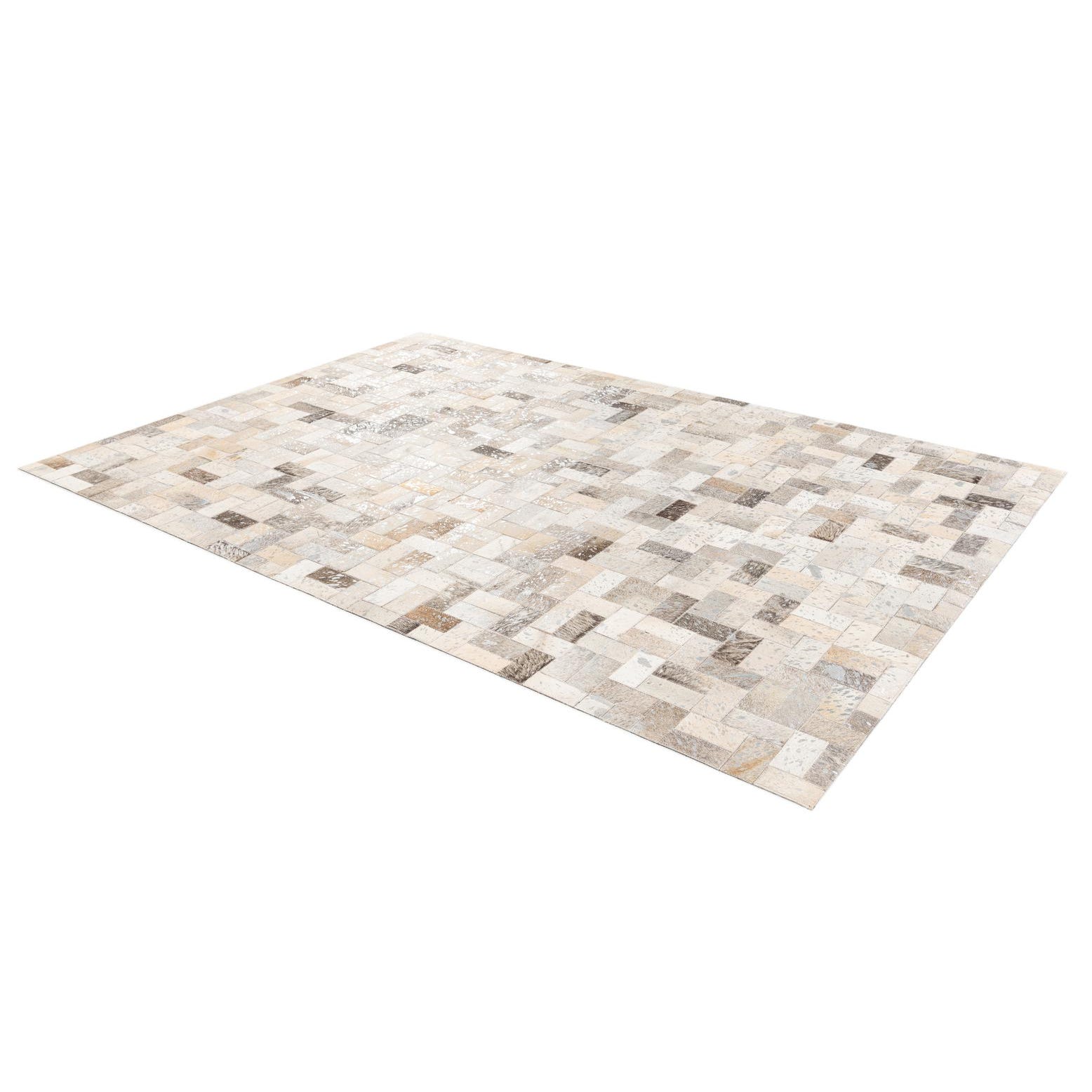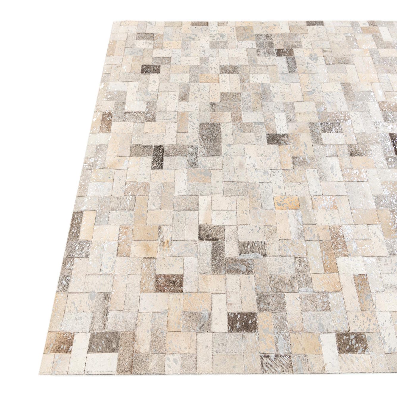 A 5x7 rectangular modern cowhide rug featuring a patchwork of multi-colored natural hide squares and rectangles.