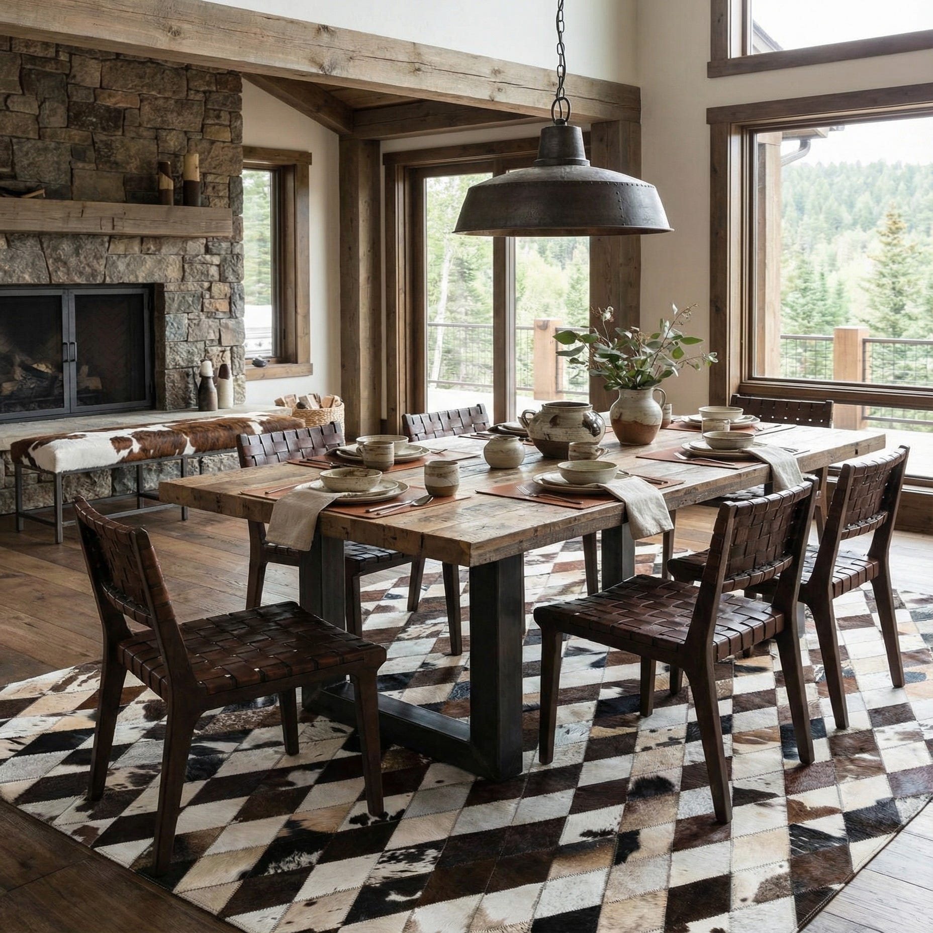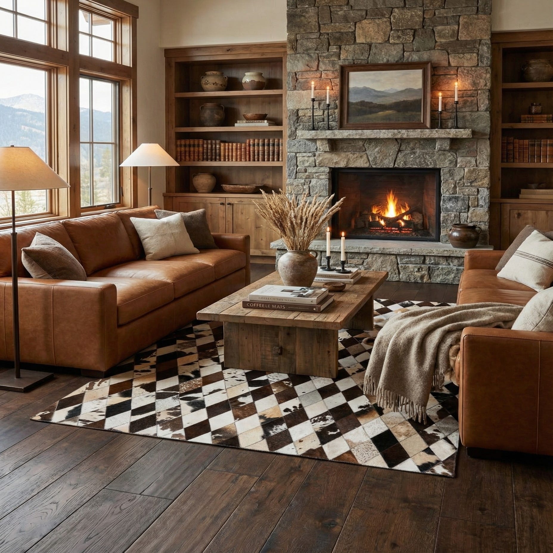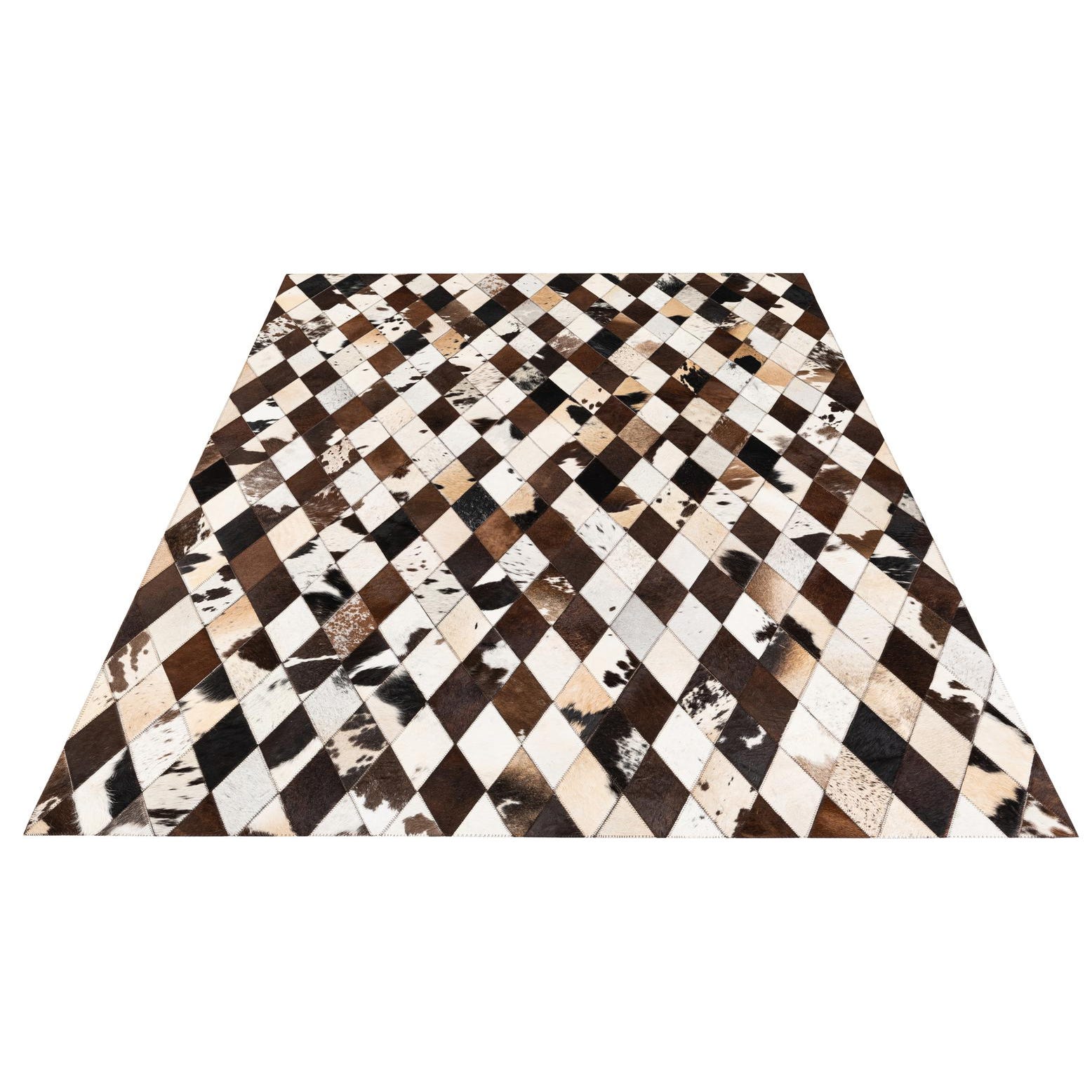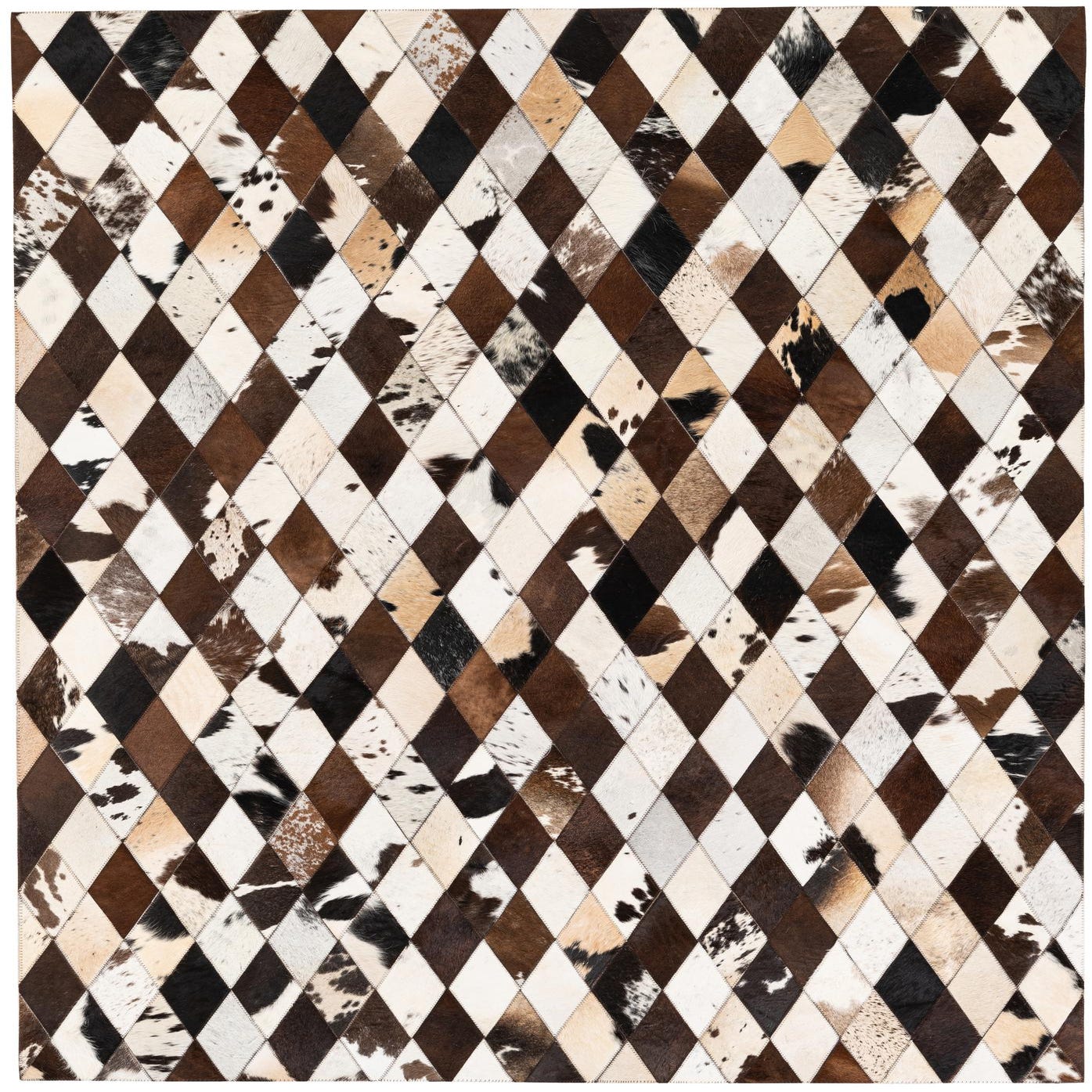 A 5x7 rectangular modern rug made from multi-colored cowhide and leather patches in a diamond pattern.