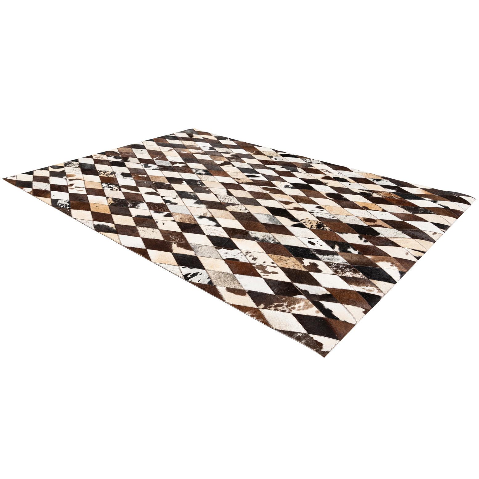 A 5x7 rectangular modern cowhide rug with a multi-colored diamond pattern, featuring shades of brown, black, and white.