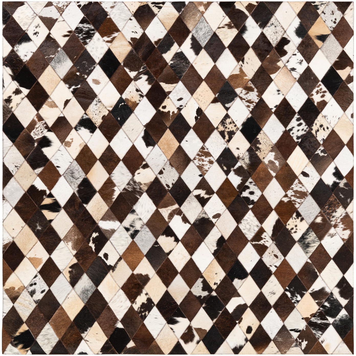 A 5x7 rectangular rug featuring a modern diamond pattern made from multi-colored cowhide and leather patches.