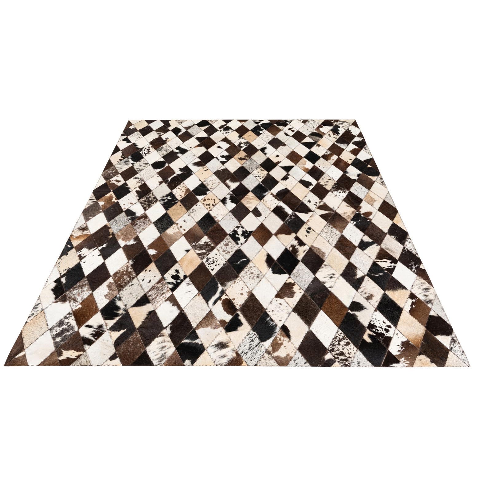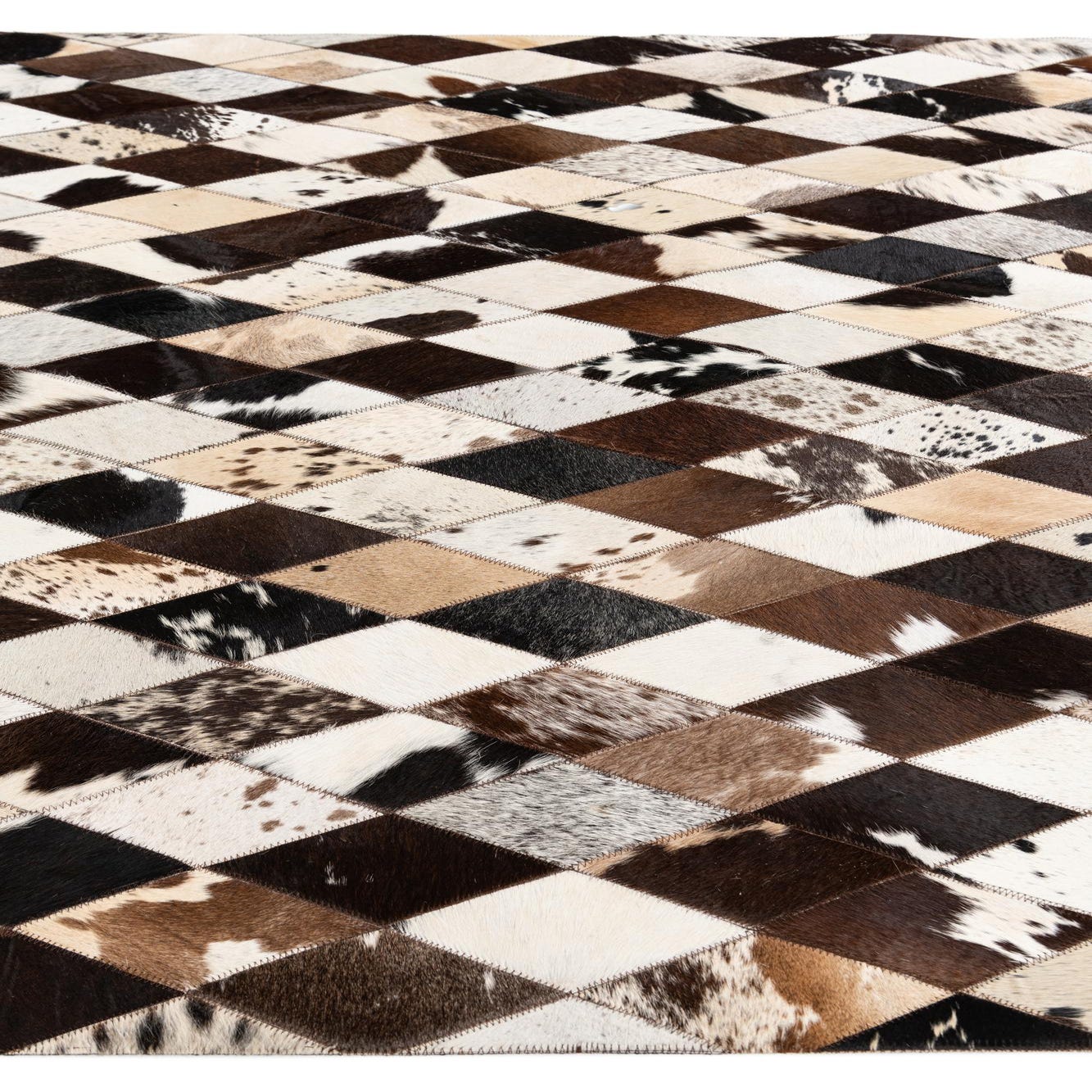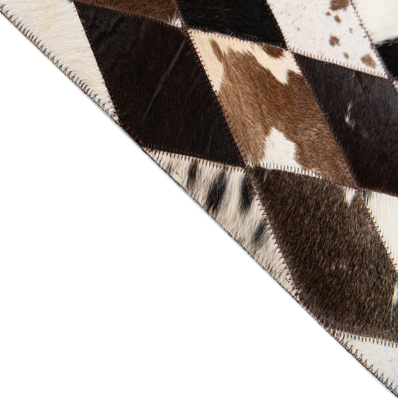 A 5x7 rectangular multi-colored cowhide rug with a modern diamond patchwork pattern in shades of brown, black, and white.
