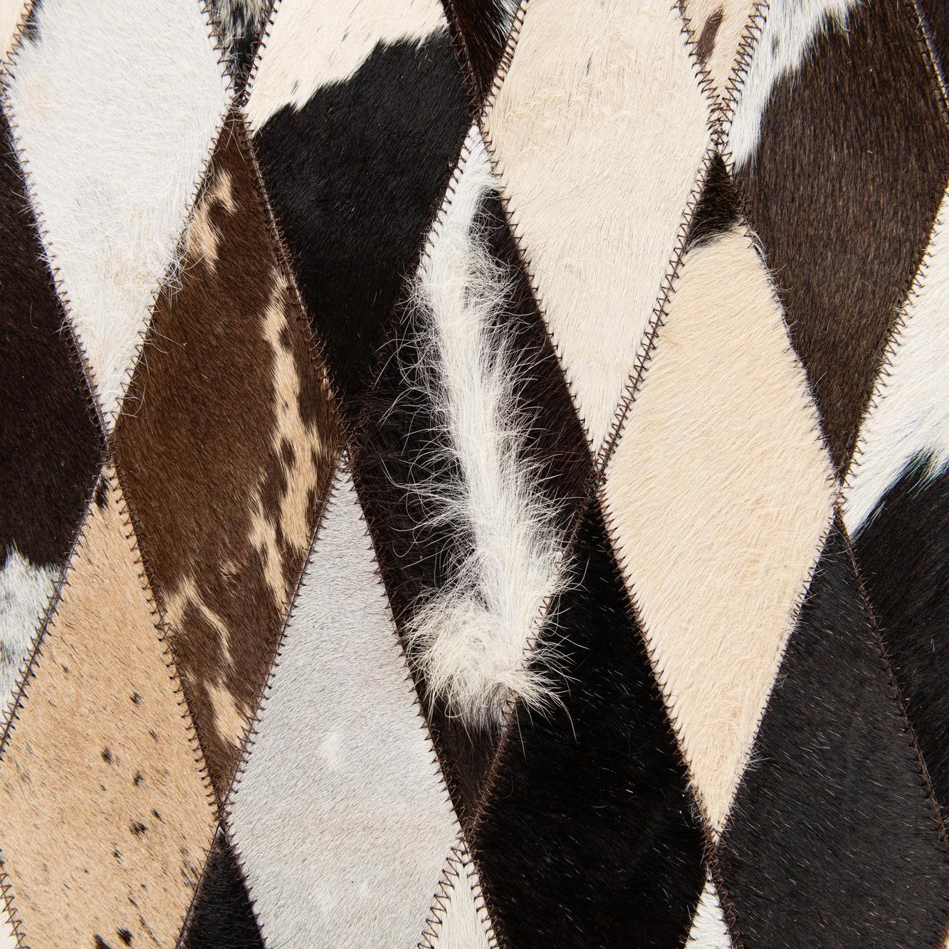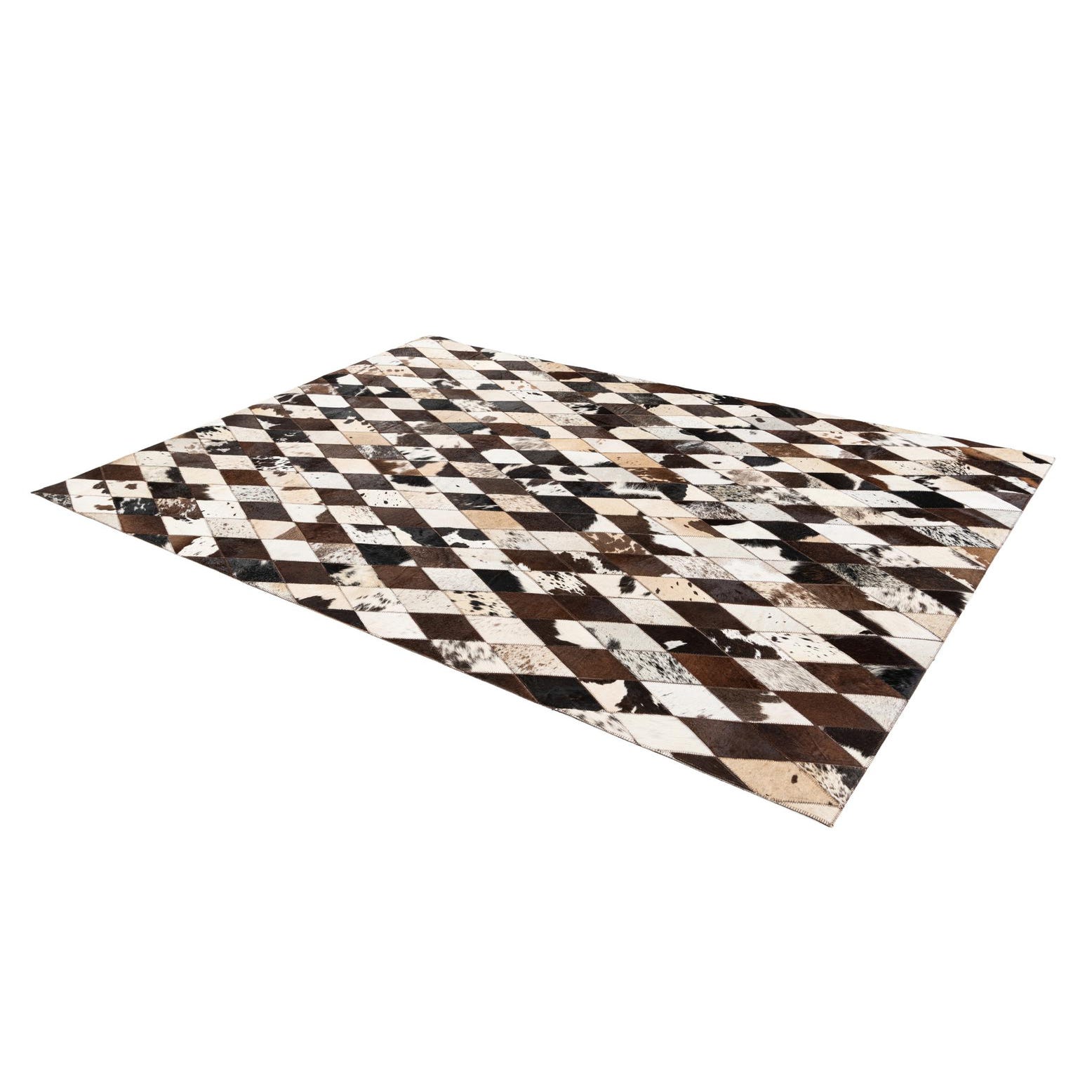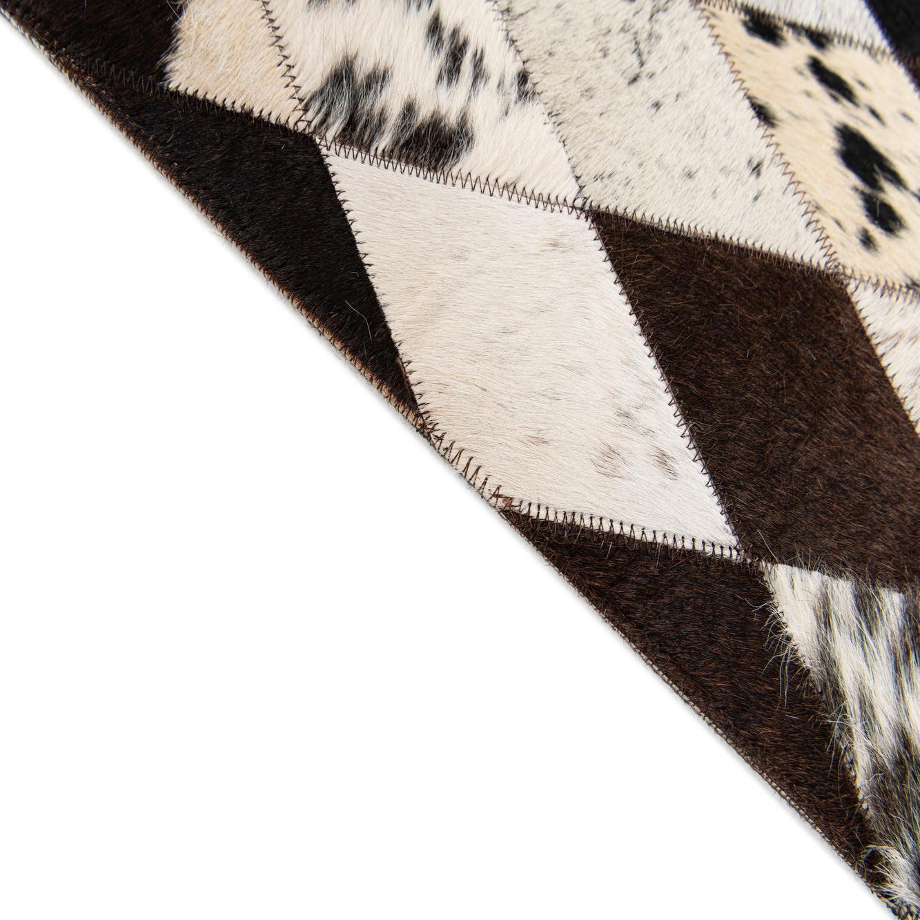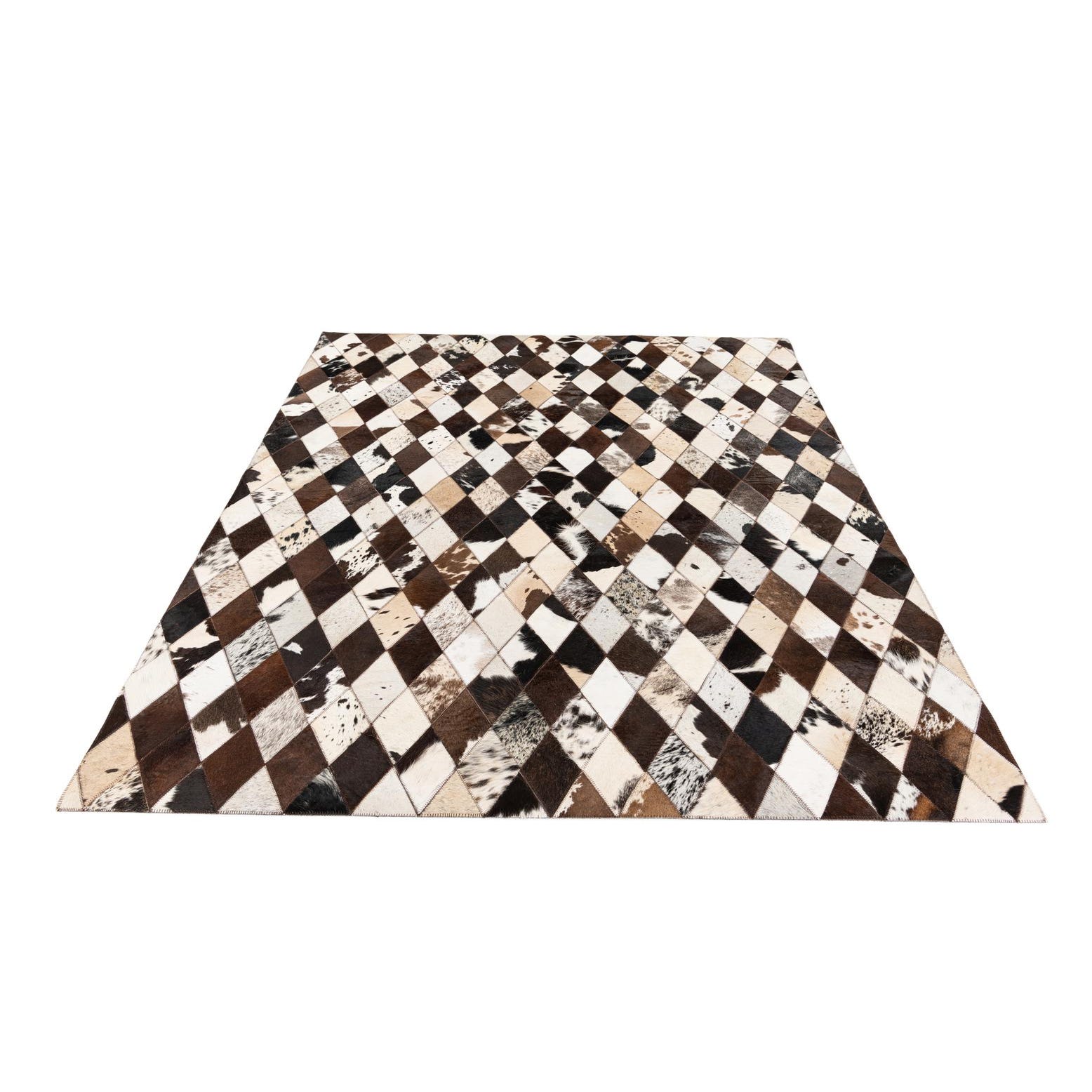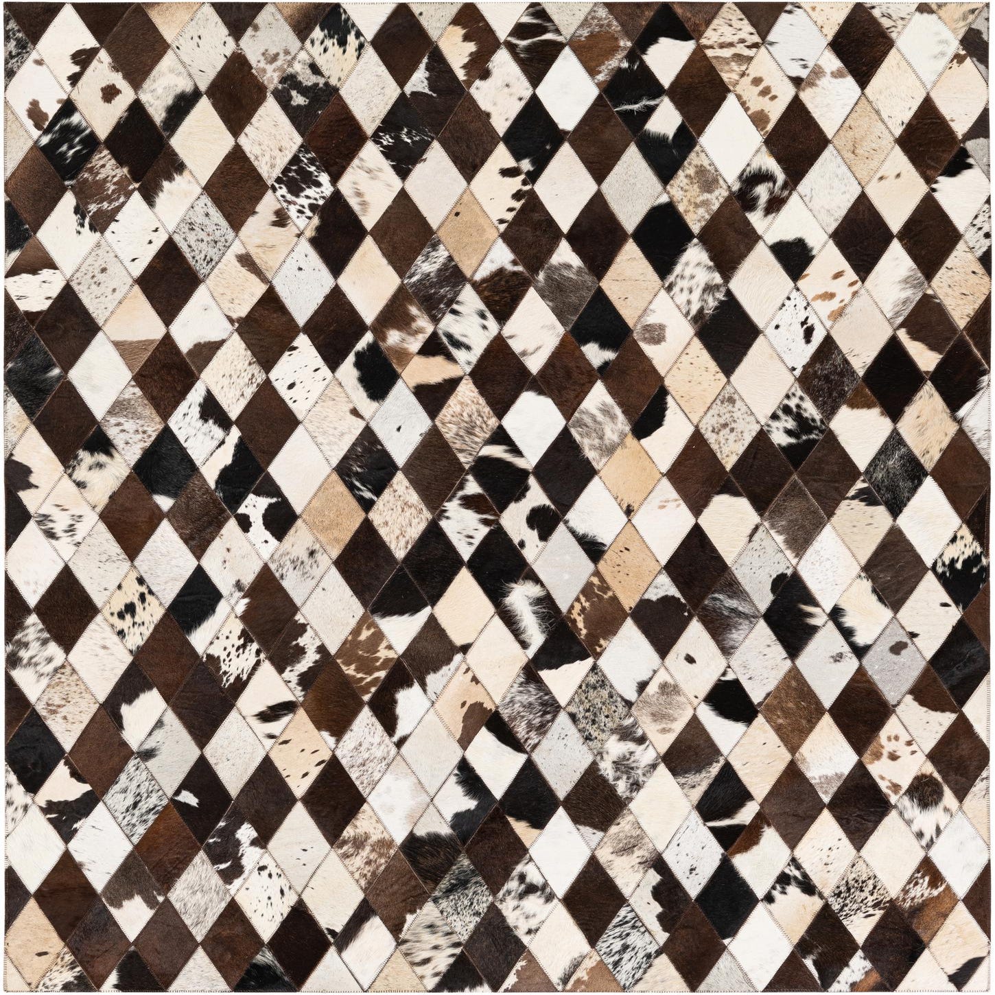A 5x7 rectangular multi-colored cowhide rug with a modern diamond patchwork pattern in various shades of brown, black, and white.