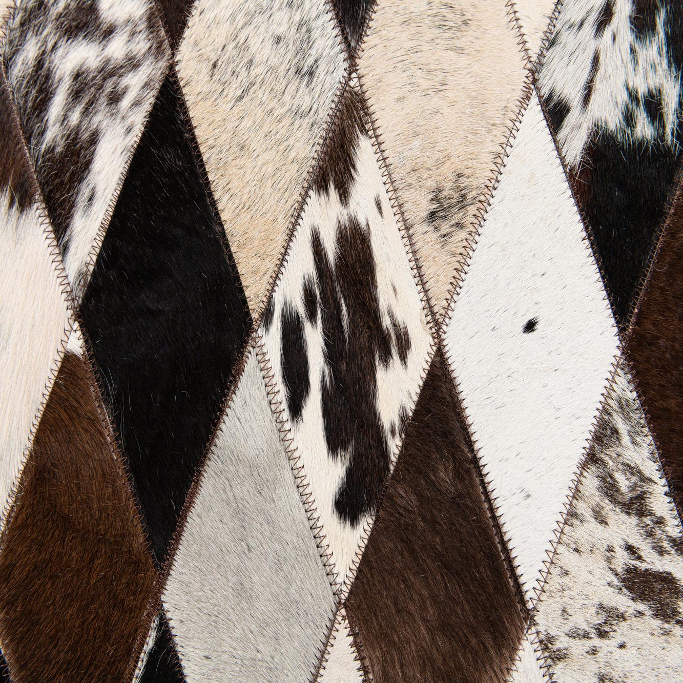 A 5x7 rectangular modern cowhide rug featuring a diamond patchwork pattern in various shades of brown, black, and white.