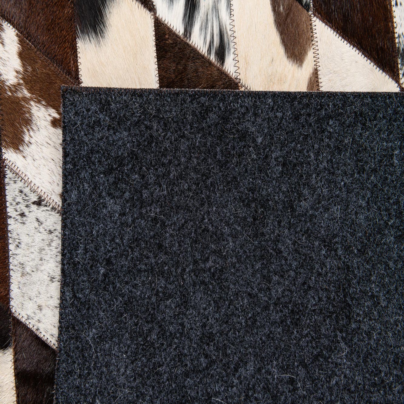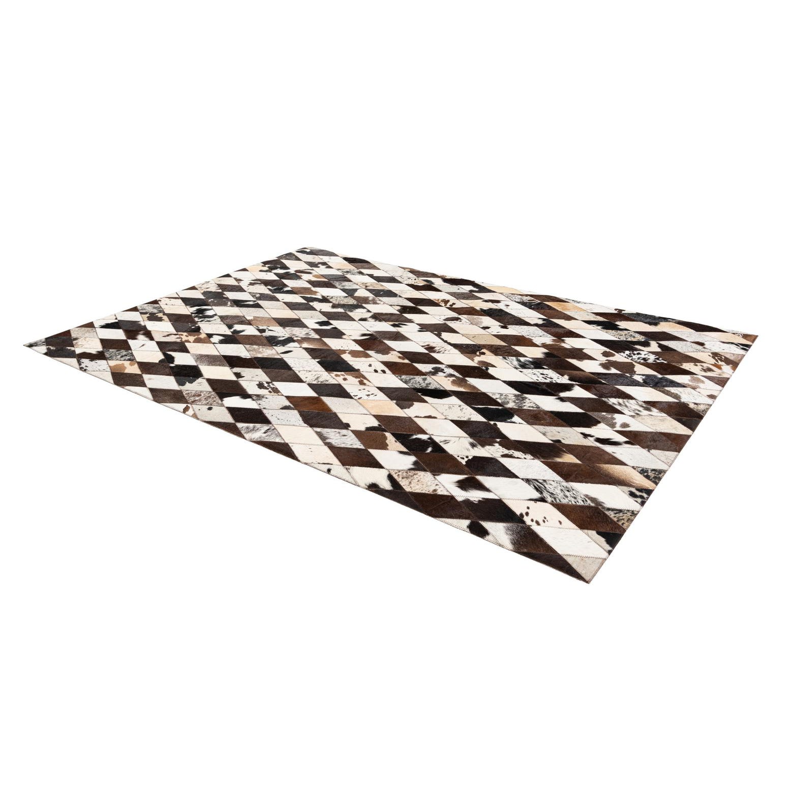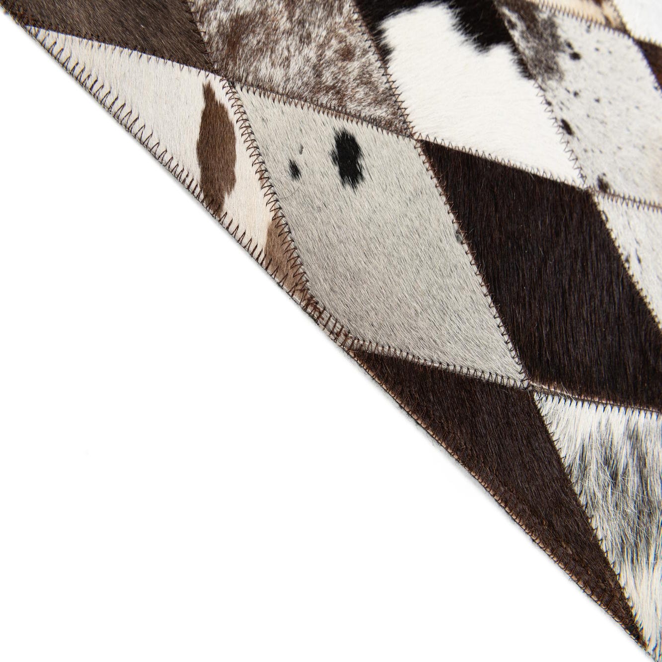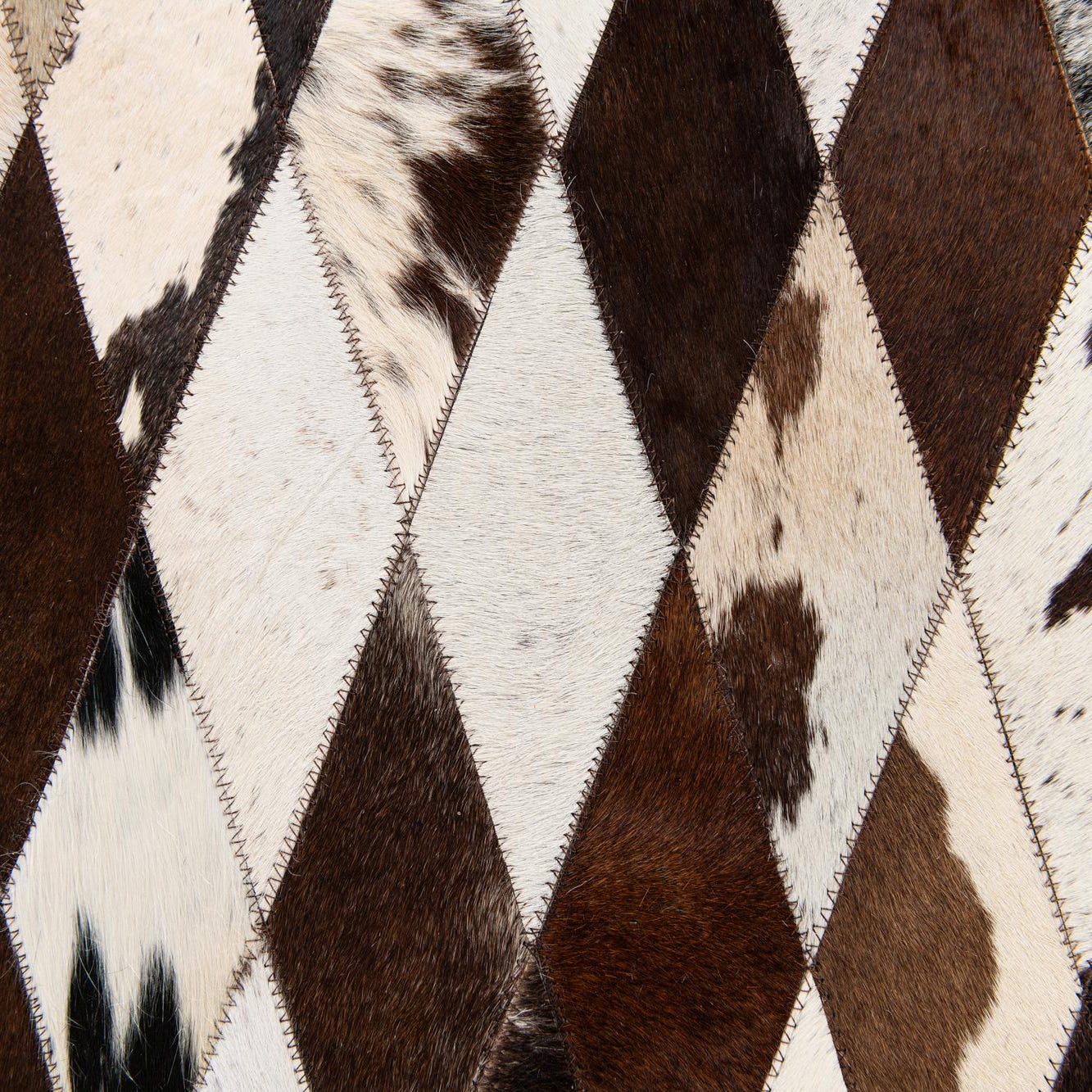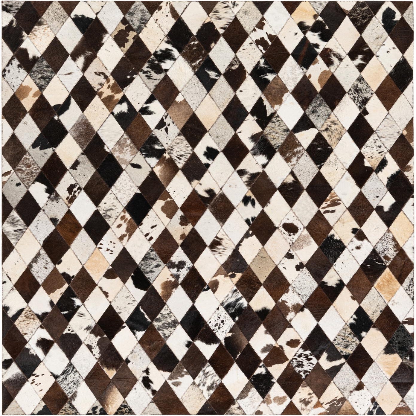 A 5x7 rectangular Cowhide Stocks rug featuring a modern diamond pattern in multi-colored natural cowhide and leather patches.
