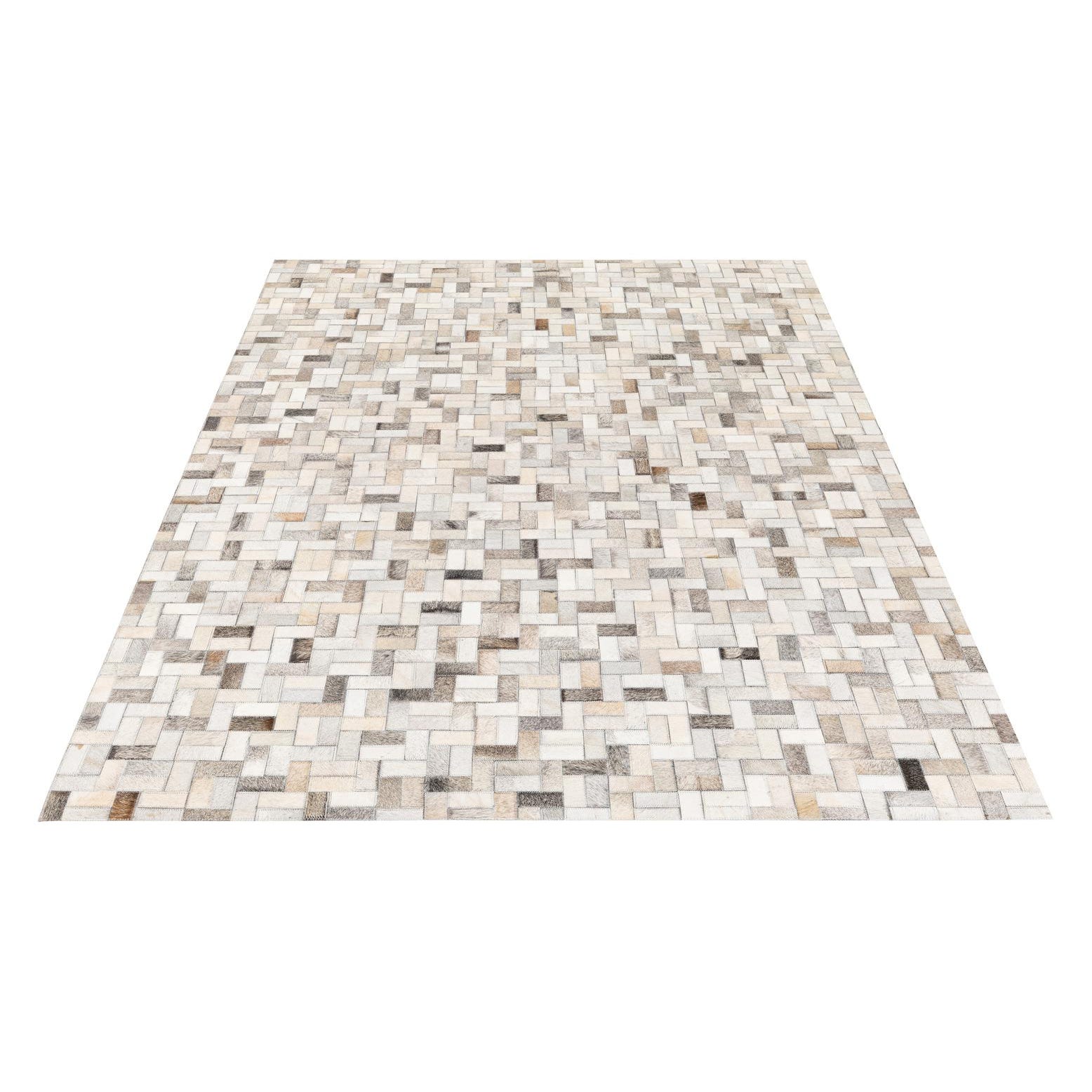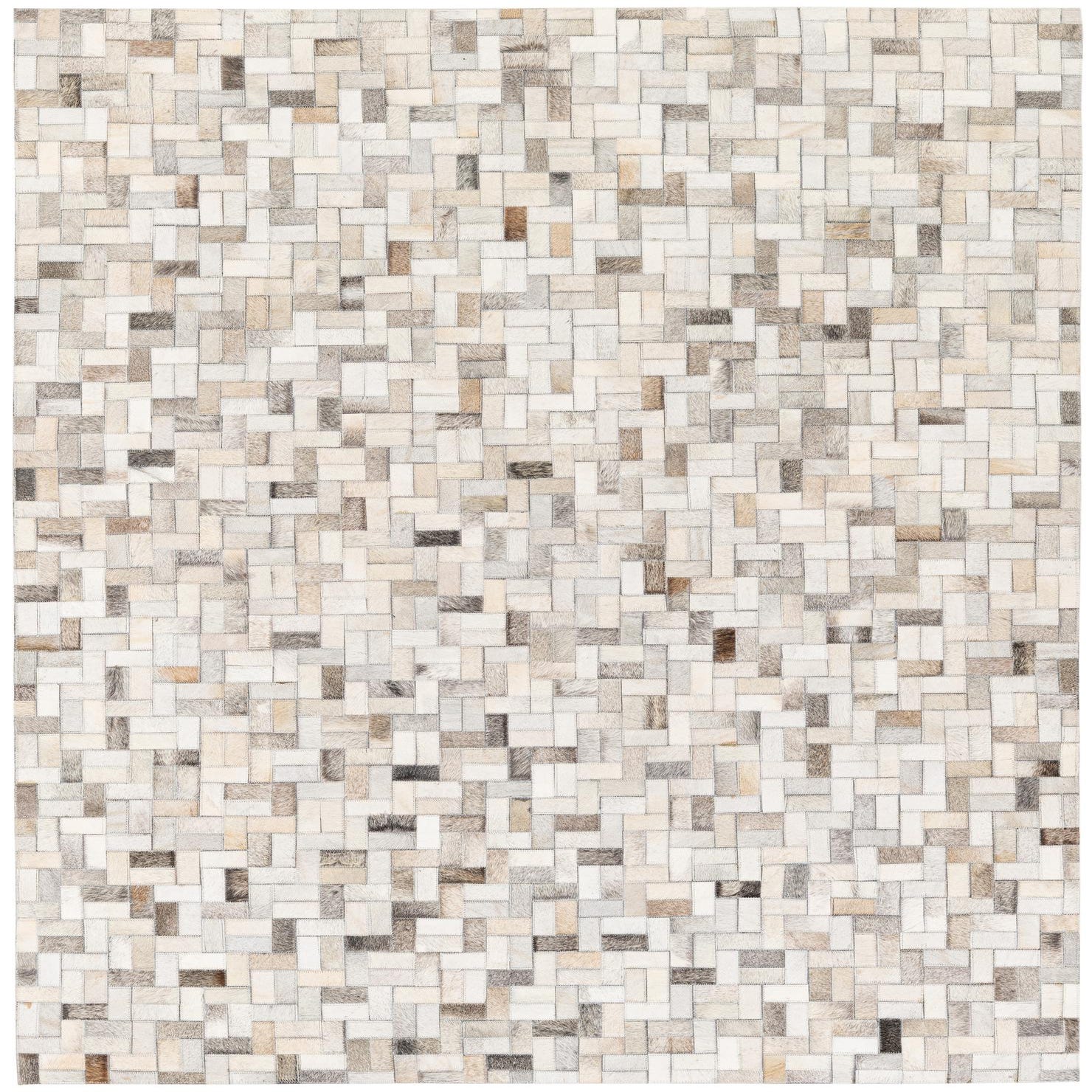 A 5x7 rectangular modern cowhide rug featuring a patchwork of multi-colored natural hide squares and rectangles, perfect for an indoor living space.