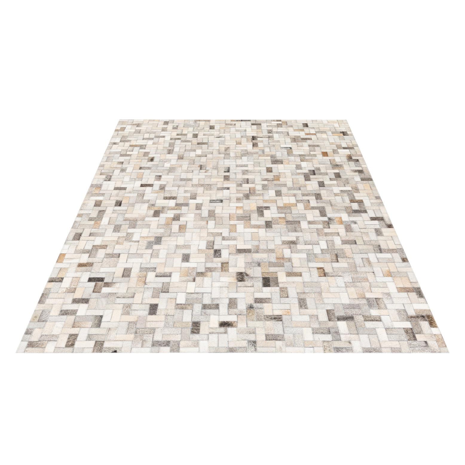 A 5x7 rectangular Cowhide Stocks rug featuring a modern patchwork of multi-colored cowhide and leather squares.