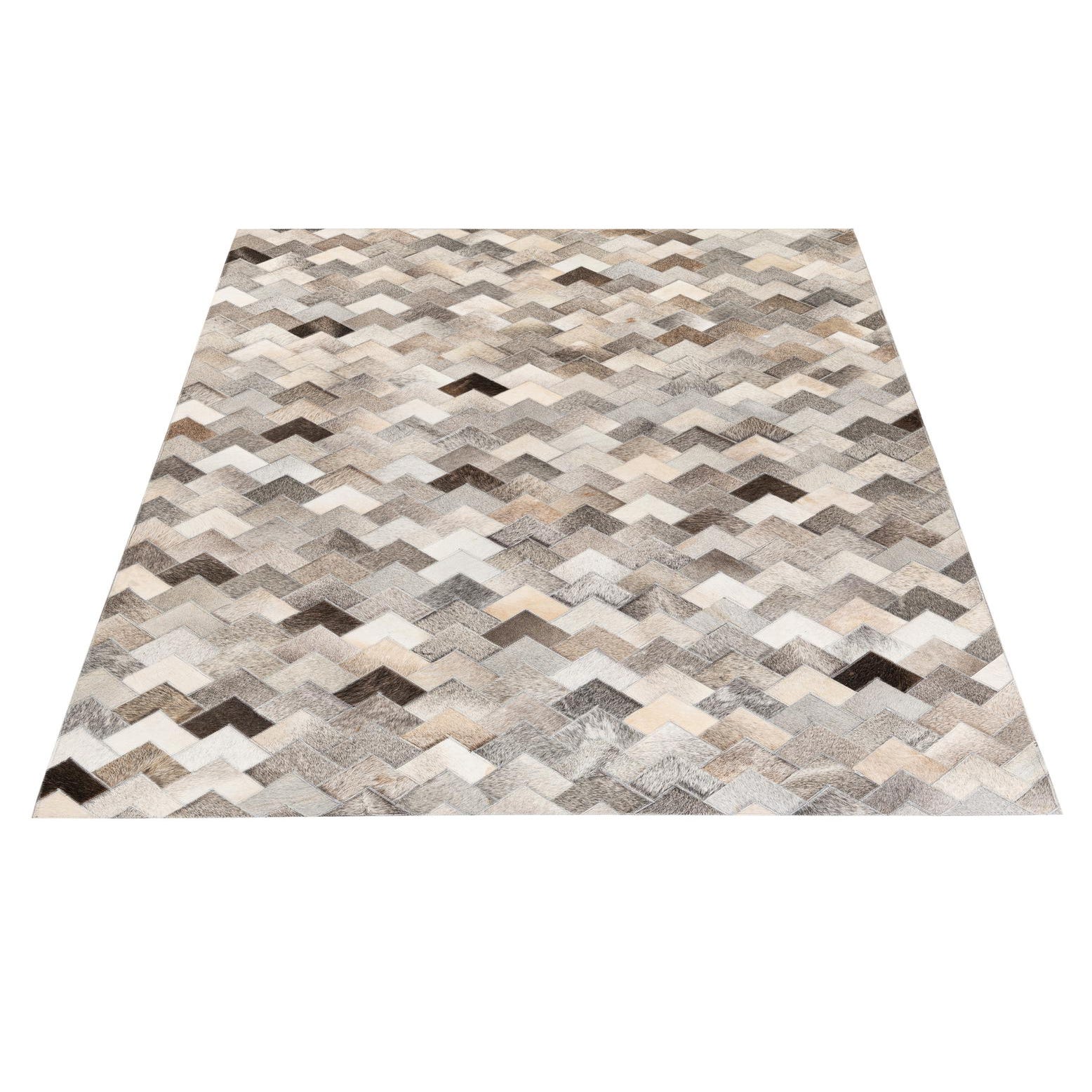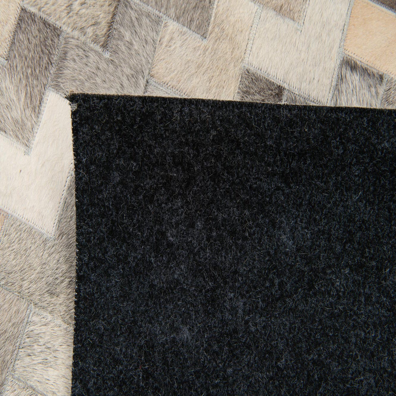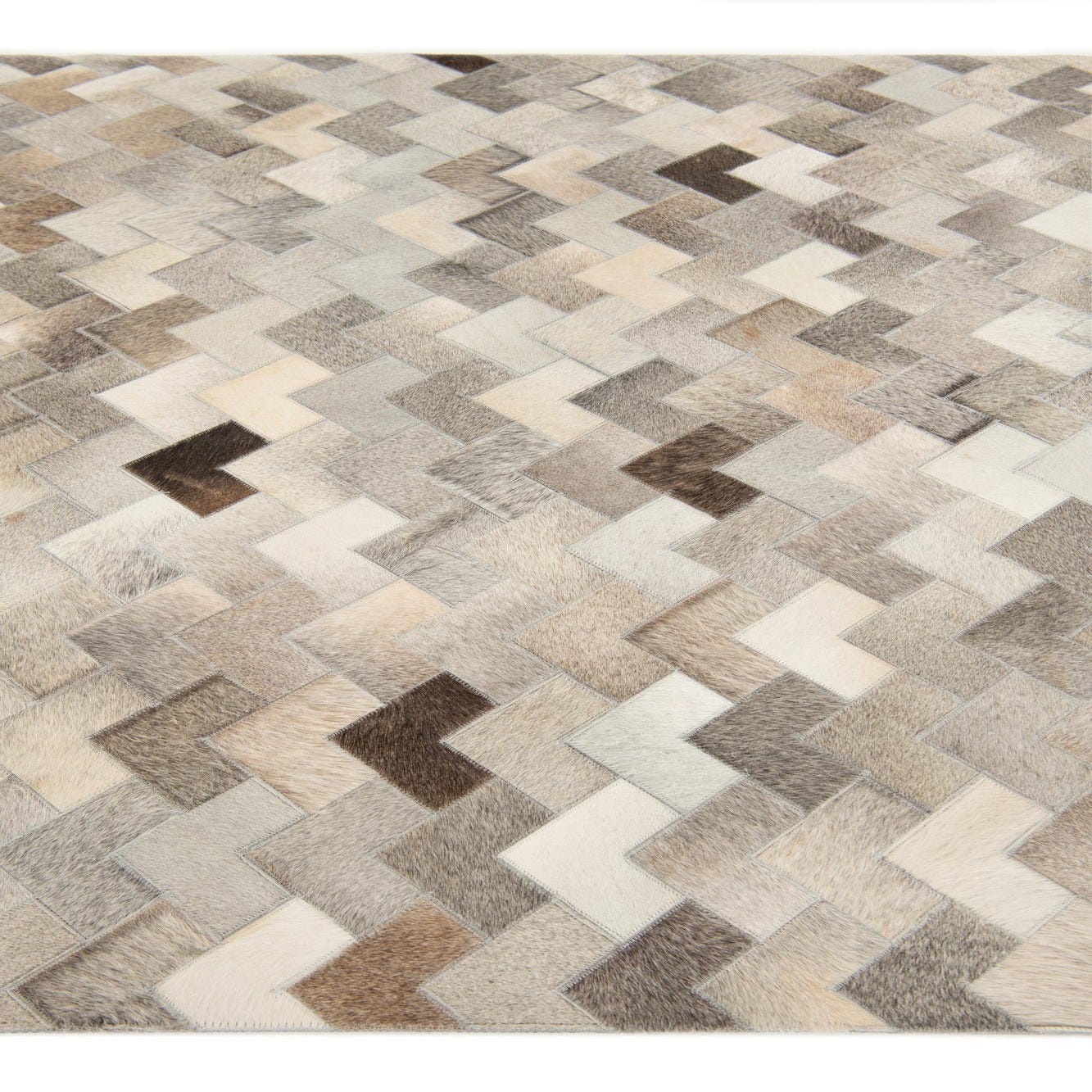 Handmade from cowhide and leather, this rug displays a stitched chevron patchwork that creates a refined zigzag field across a multi-tonal background. Patches of beige, brown, gray and ivory move across the surface with natural variation in tone and hair direction, producing a soft, tactile sheen. The hair-on-hide texture is smooth underfoot, while the visible leather seams add subtle structure and craftsmanship to the overall feel.