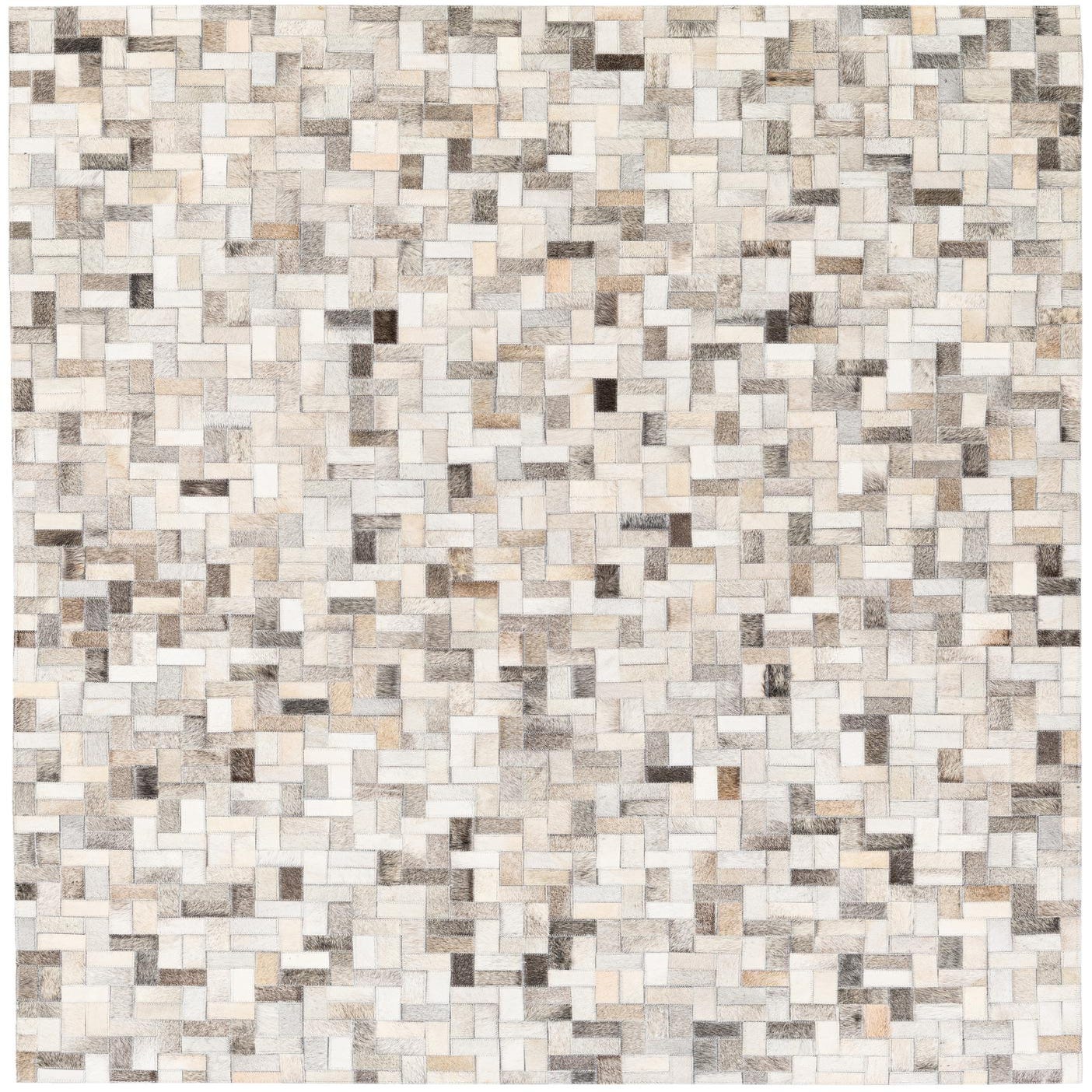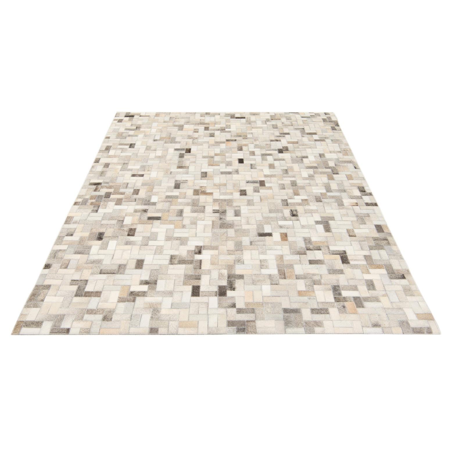 A 5x7 rectangular Cowhide Stocks rug featuring a modern patchwork of multi-colored cowhide and leather squares.