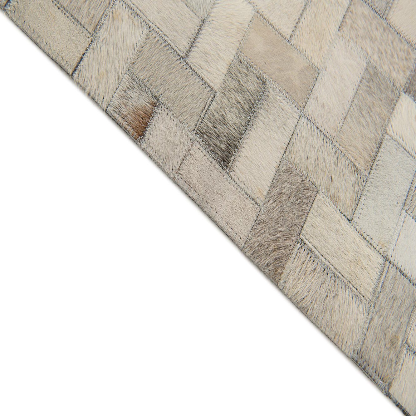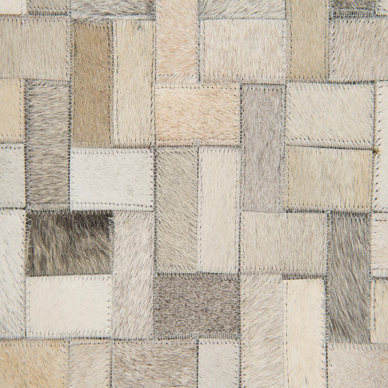 Hand made of cowhide and leather, this rug is composed of small rectangular patches arranged in a staggered, interlocking mosaic that reads like a refined basketweave. The multi-tonal background brings together ivory, beige, tan and gray patches, creating a quiet, layered effect. Running your hand across the surface you feel the hair-on-hide texture—soft to the touch with low nap and a subtle sheen where the hairs catch the light—while the stitched seams provide gentle relief and visual rhythm underfoot.