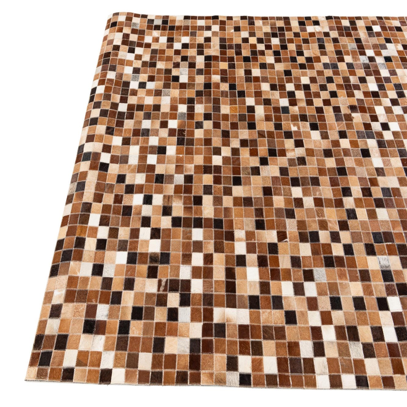 A 5x7 rectangular modern cowhide rug featuring a patchwork of multi-colored squares in various shades of brown, black, and white.