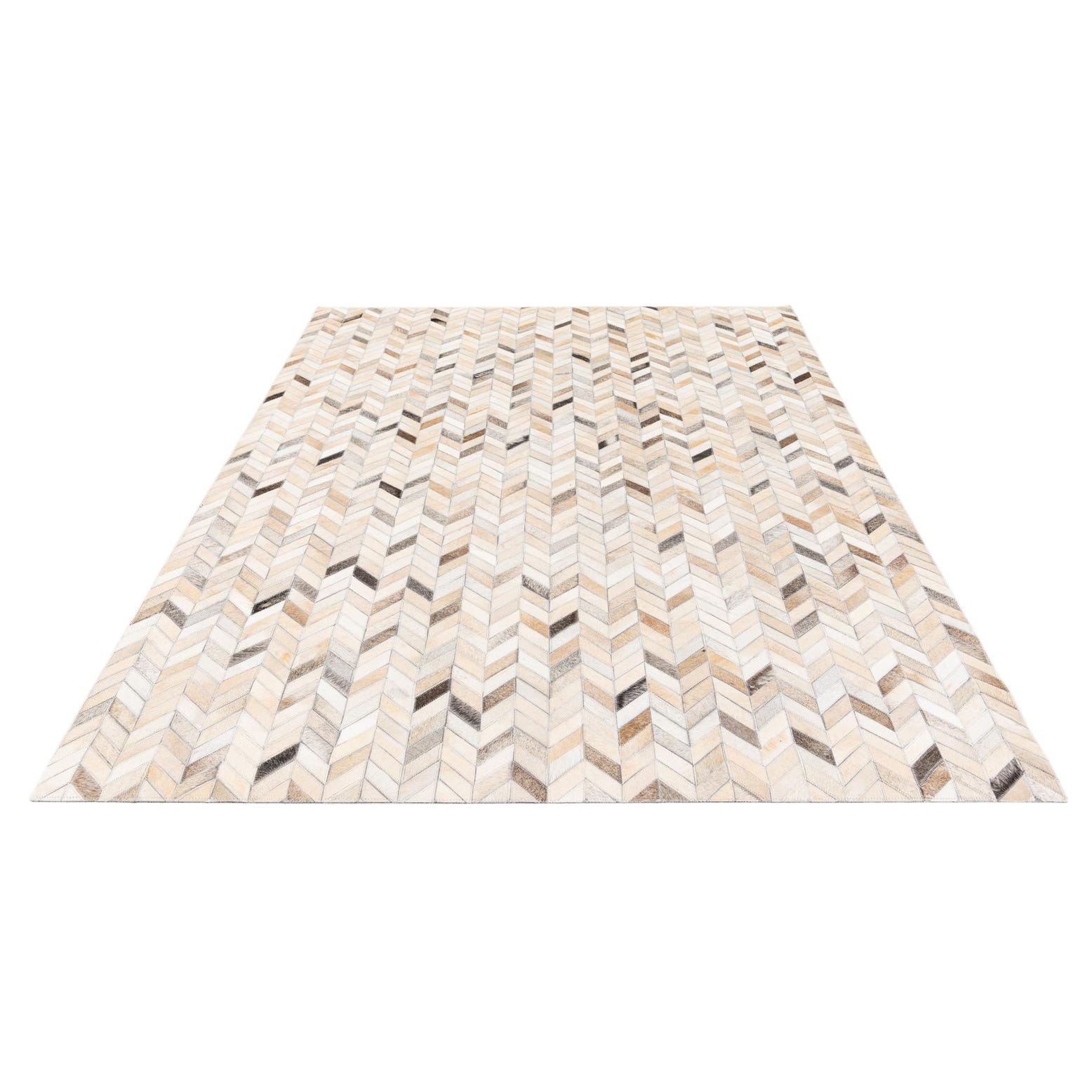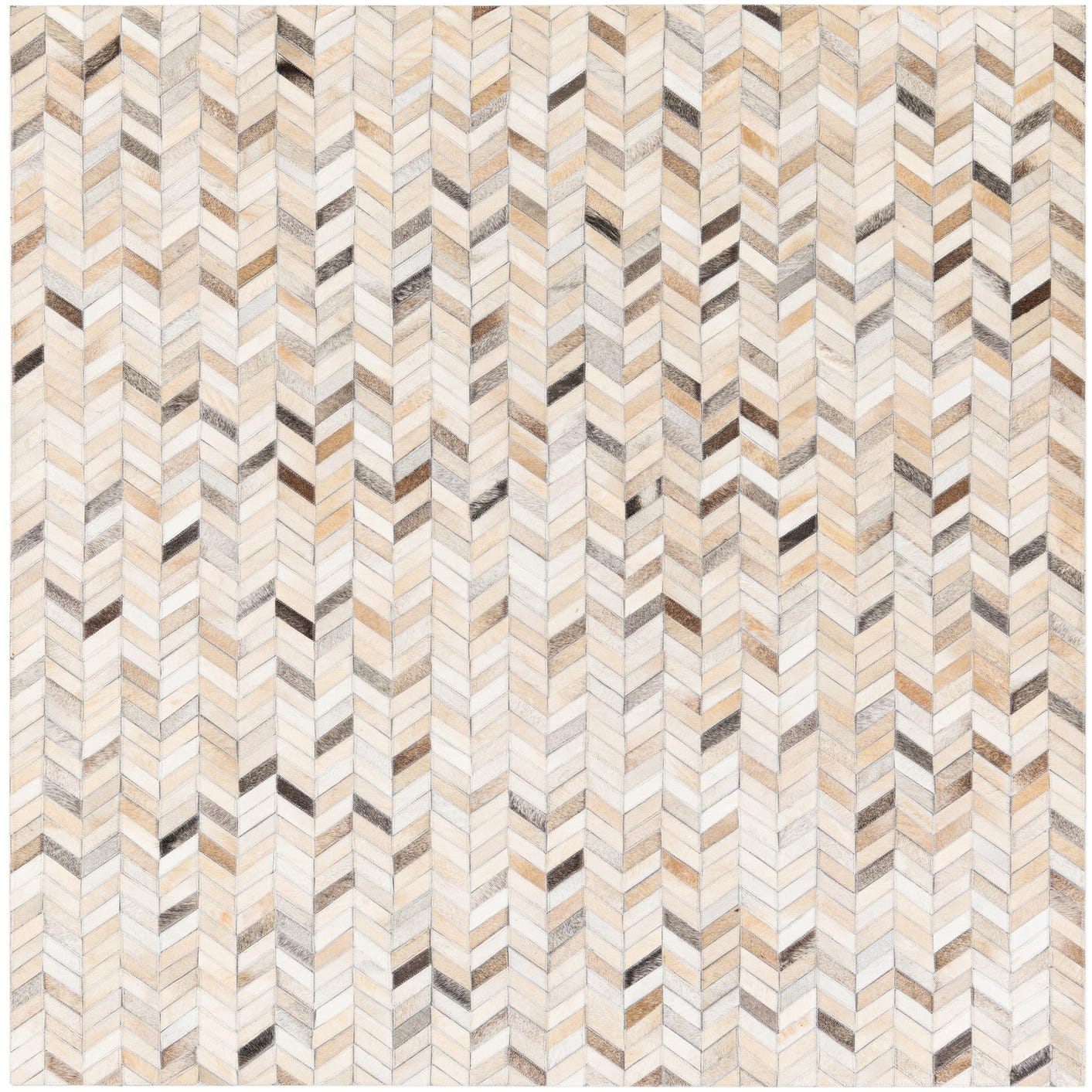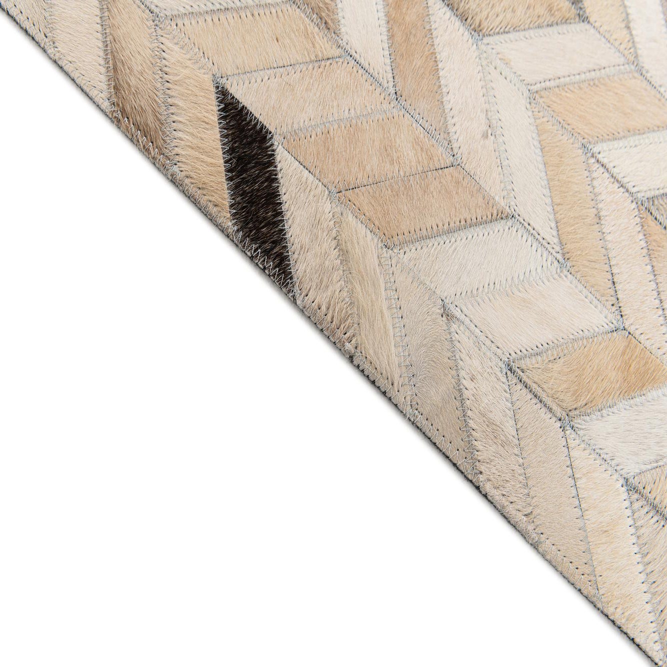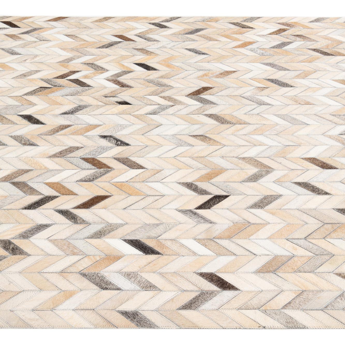 A 5x7 rectangular multi-colored cowhide rug featuring a modern chevron pattern in various natural brown, beige, and cream tones.