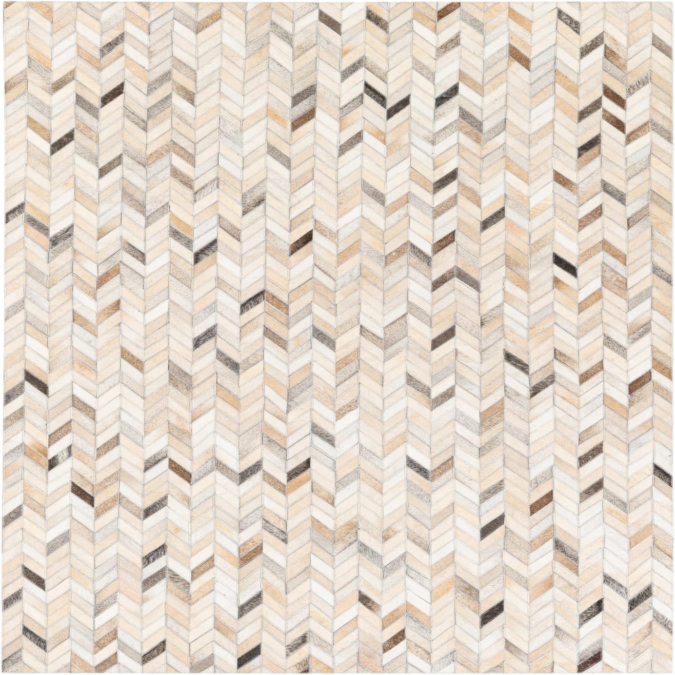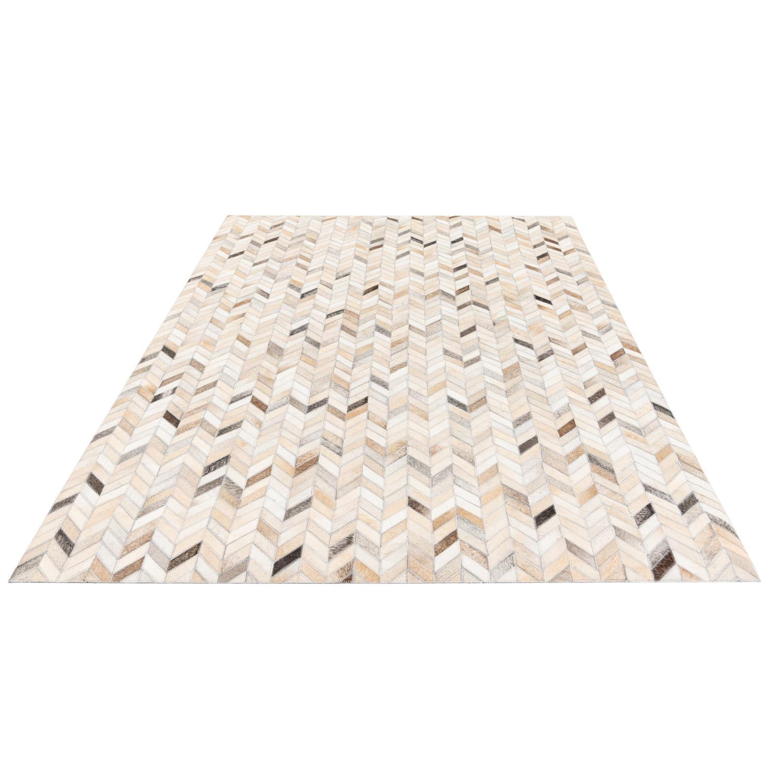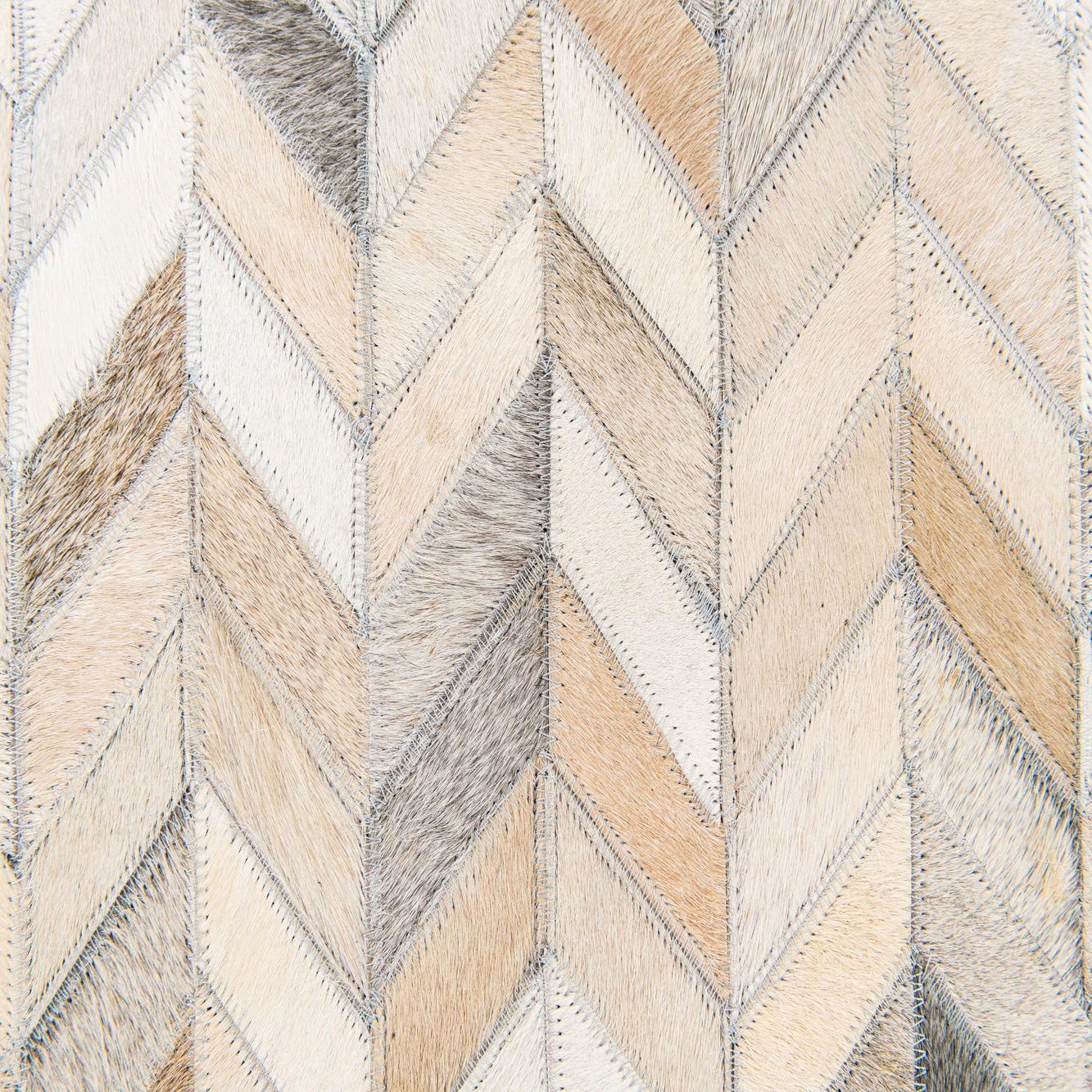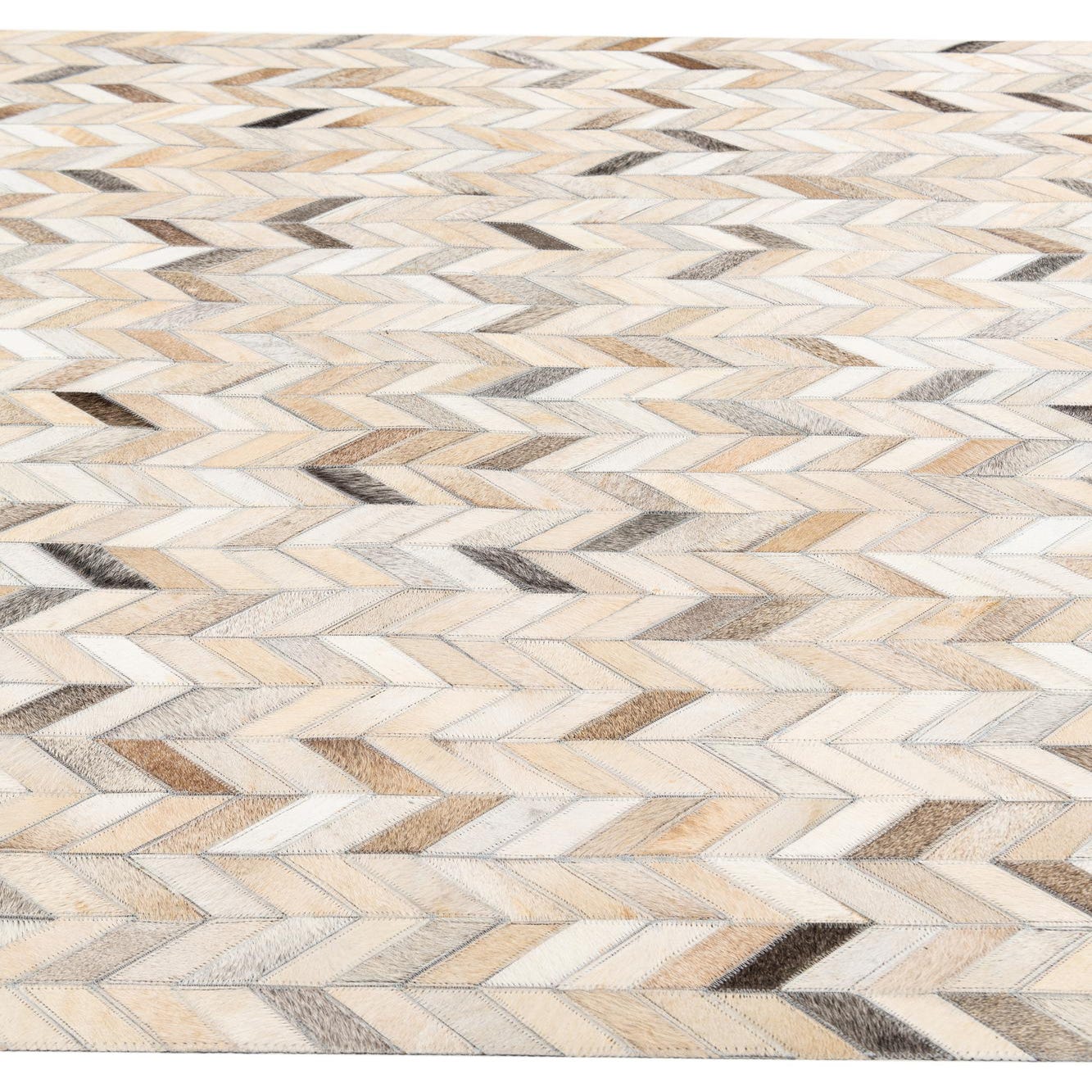 A 5x7 rectangular Cowhide Stocks rug by Rugs.com, featuring a modern chevron pattern in multi-colored natural cowhide and leather.