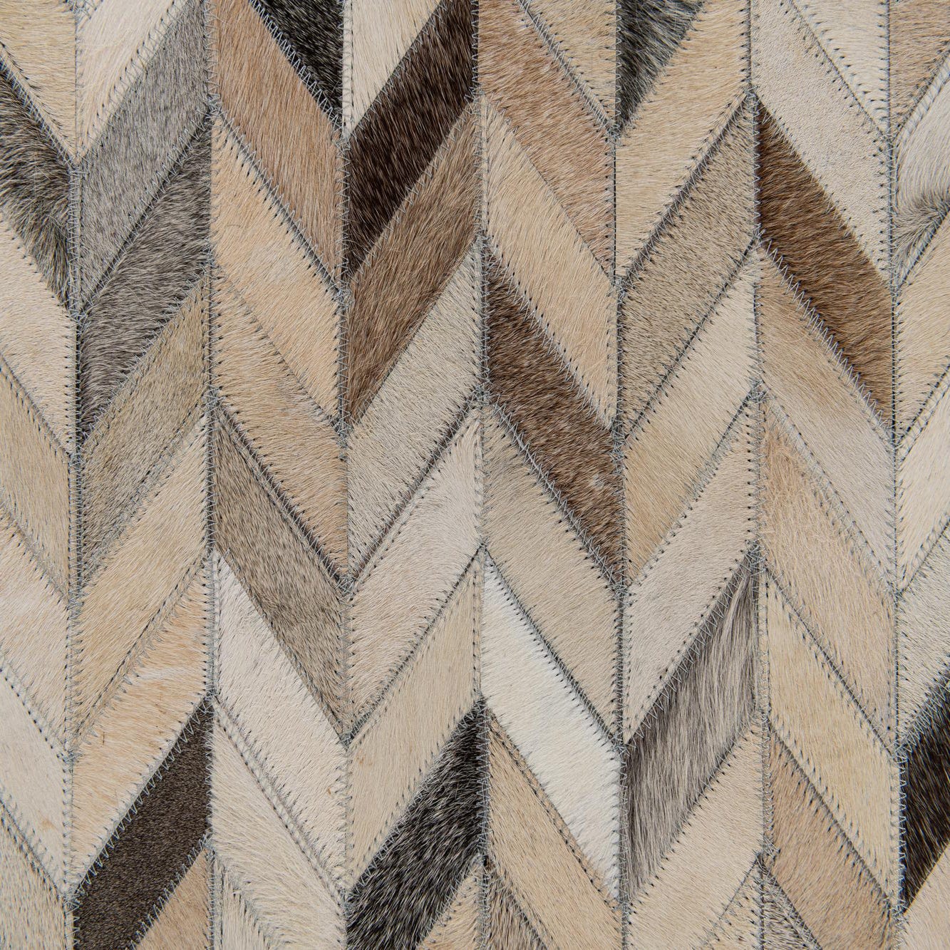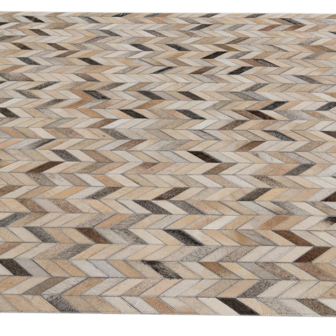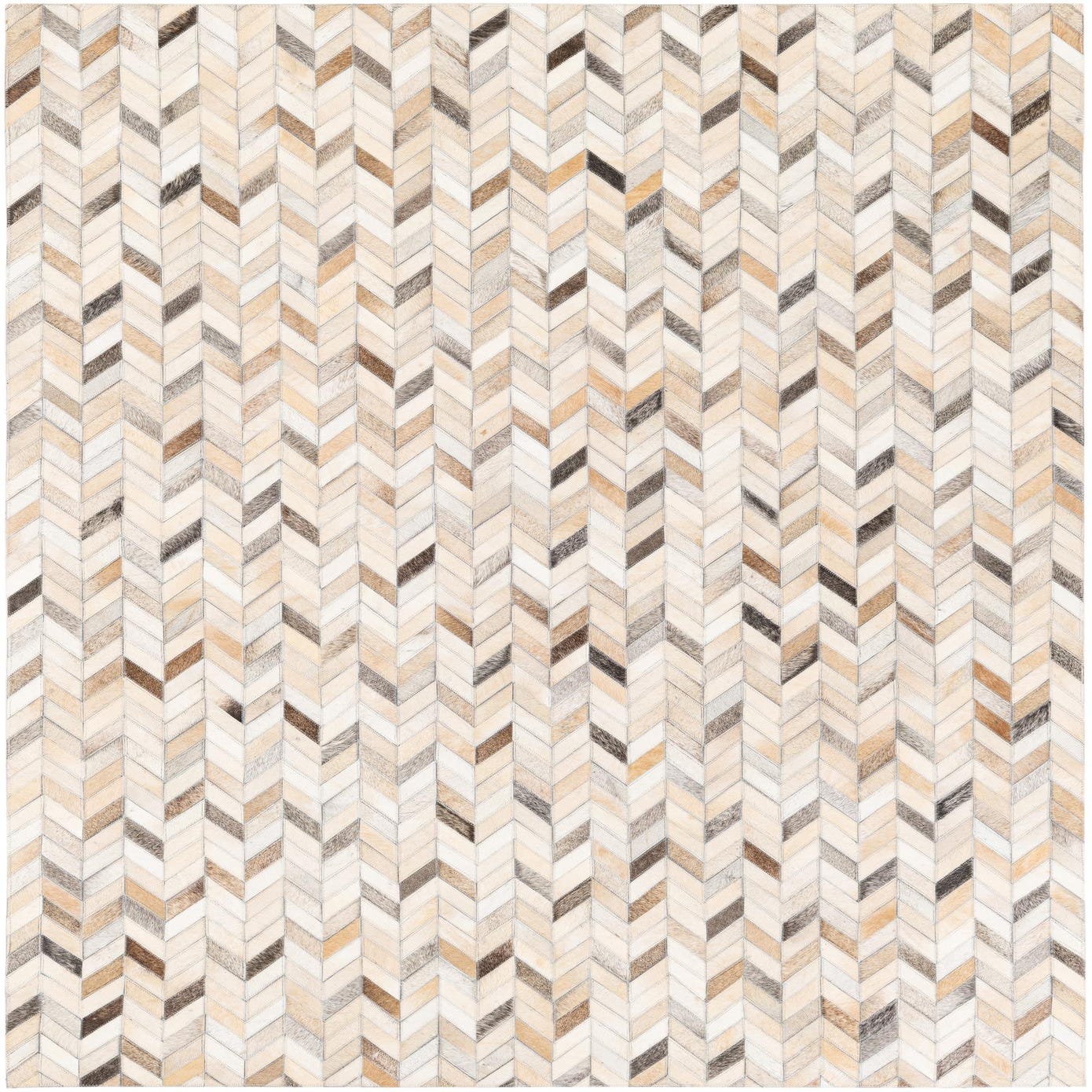 A 5x7 rectangular multi-colored cowhide rug featuring a modern chevron pattern in shades of brown, beige, and cream.