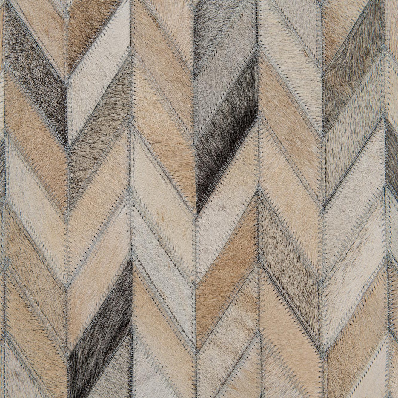 A 5x7 rectangular modern cowhide rug featuring a multi-colored chevron pattern in shades of cream, beige, brown, and grey.