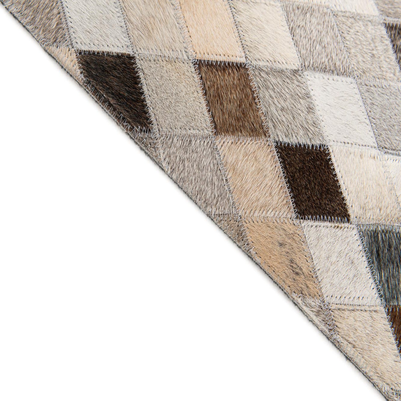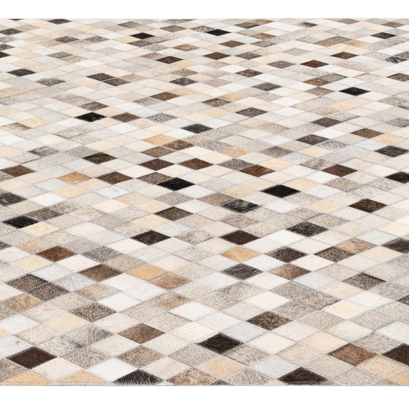 A 5x7 rectangular multi-colored modern cowhide rug with a diamond patchwork pattern in various shades of brown, beige, cream, and black.