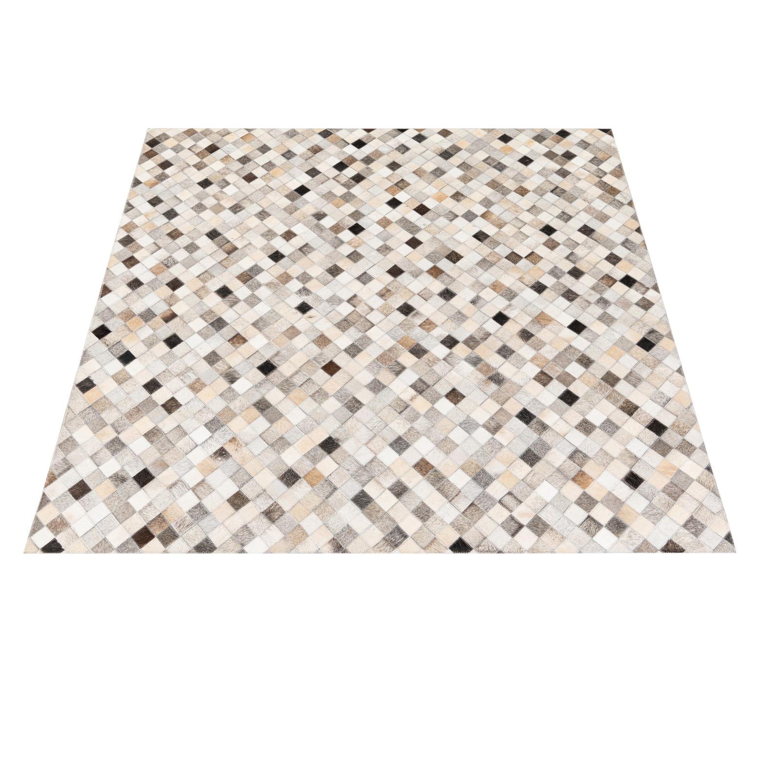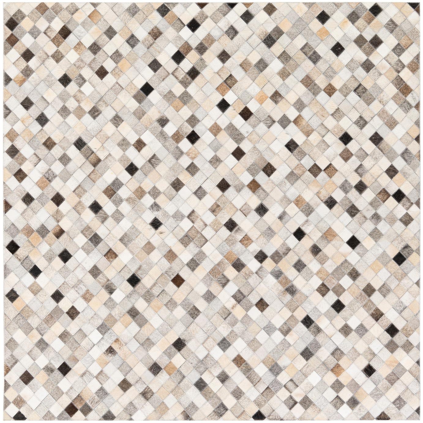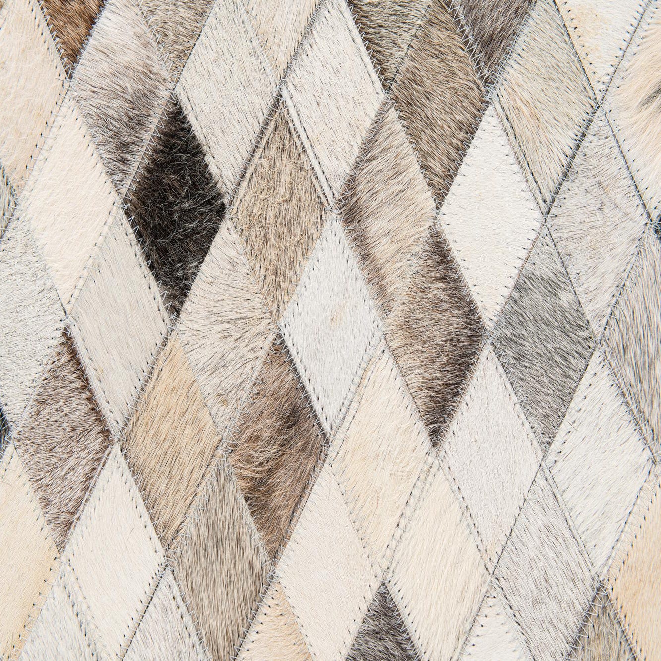 A 5x7 rectangular Cowhide Stocks rug featuring a modern diamond pattern in multi-colored natural cowhide and leather.